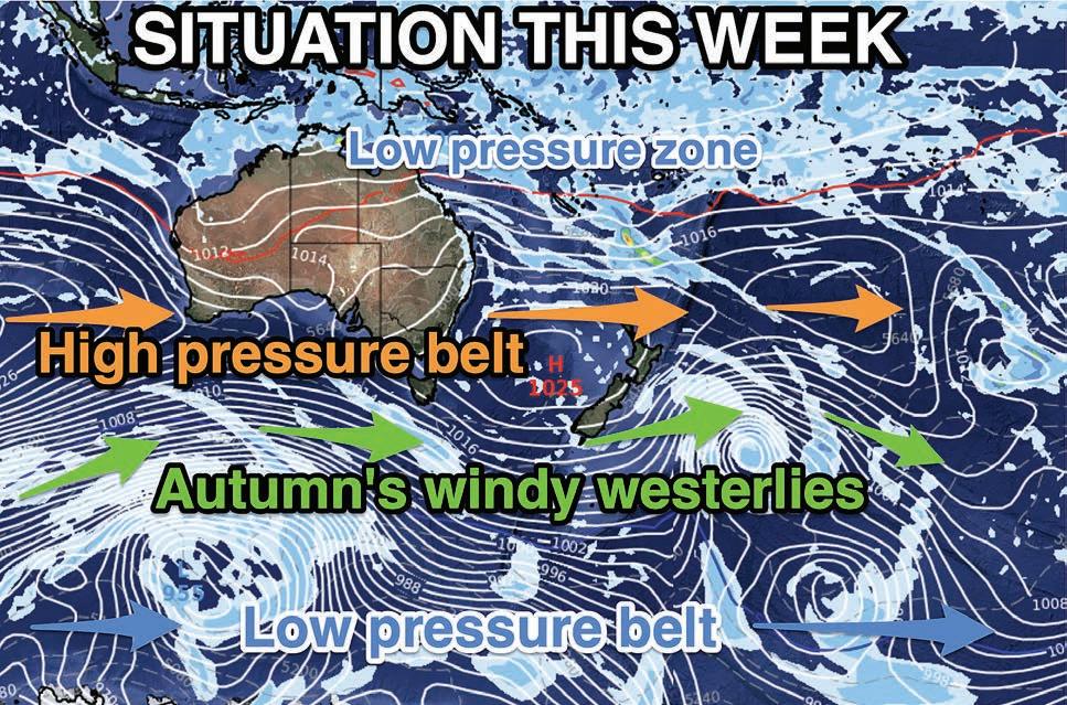 The storm in the Tasman Sea last week (that helped generate the rain) dropped south of New Zealand and into a very stormy ocean, signalling perhaps a start to more traditional autumn weather across the country.