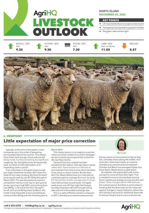 The current AgriHQ indicator price for prime lamb is $10.95/kg in the North Island and $10.85/kg in the South Island.