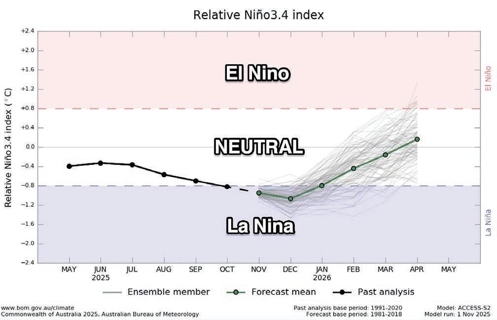 NEUTRAL: Global modelling suggests the Pacific may just dip into a technical La Niña this month or in December – but going into early 2026 it looks to return to neutral. Image: BoM