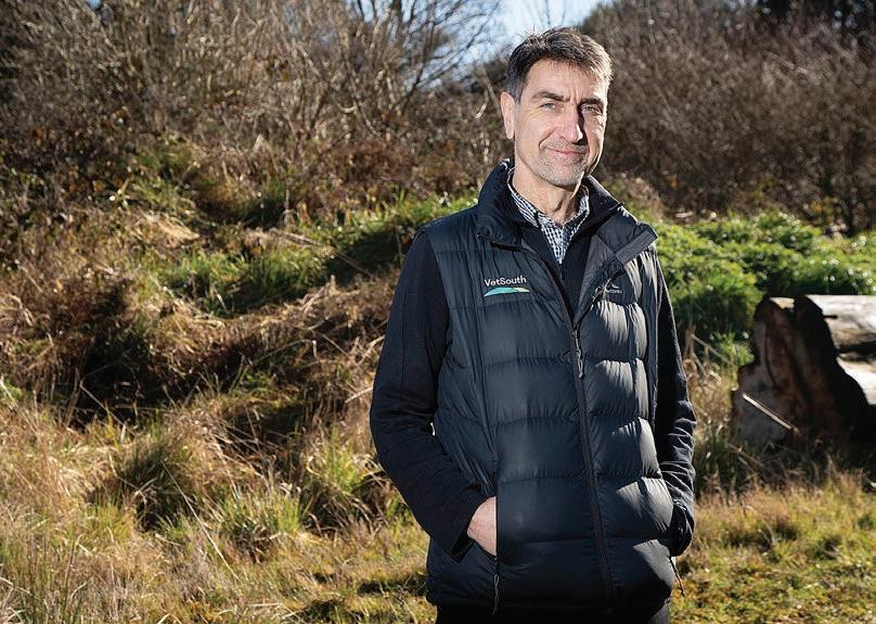There could be fewer vet clinics – and some of them owned offshore – as the sector consolidates in line with international trends. Pictured, with dog Archie Hinton, is Mark Bryan, clinical director of South Island-owned Comhla Vet, which employs more than 300 vets in about 60 clinics in New Zealand and Australia. Photo: Gerhard Uys NEWS 9
