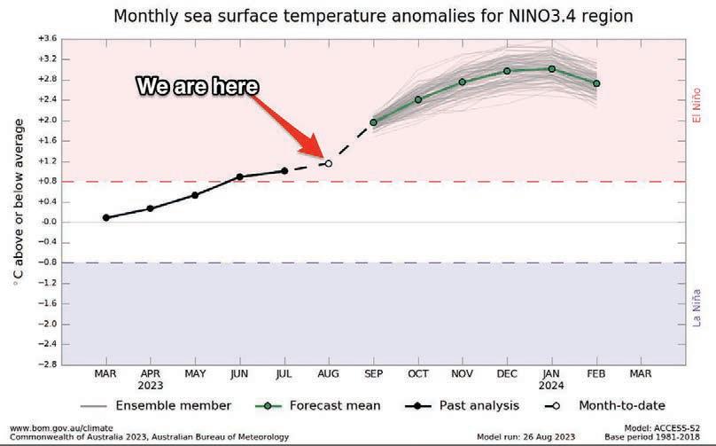 SEA surface temperatures in the tropical Pacific are still exceeding El Niño thresholds and have continued to warm slightly over the past fortnight. Climate models indicate further warming of the central to eastern Pacific is likely this year, with these sea surface temperatures remaining above El Niño thresholds until at least early 2024.