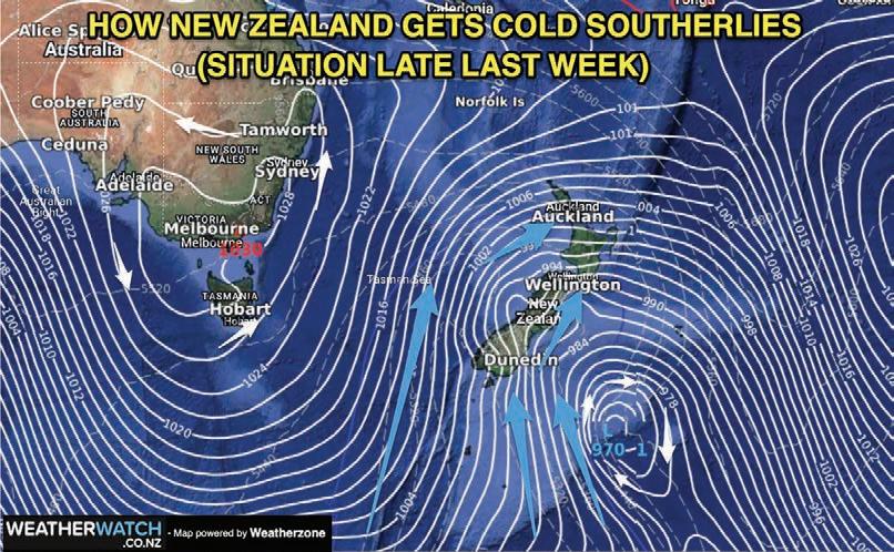 We then also need a lowpressure zone southeast of Dunedin. When you have the Tasmania high-pressure zone coupled with the low-pressure zone southeast of Dunedin, NZ gets a major cold blast.