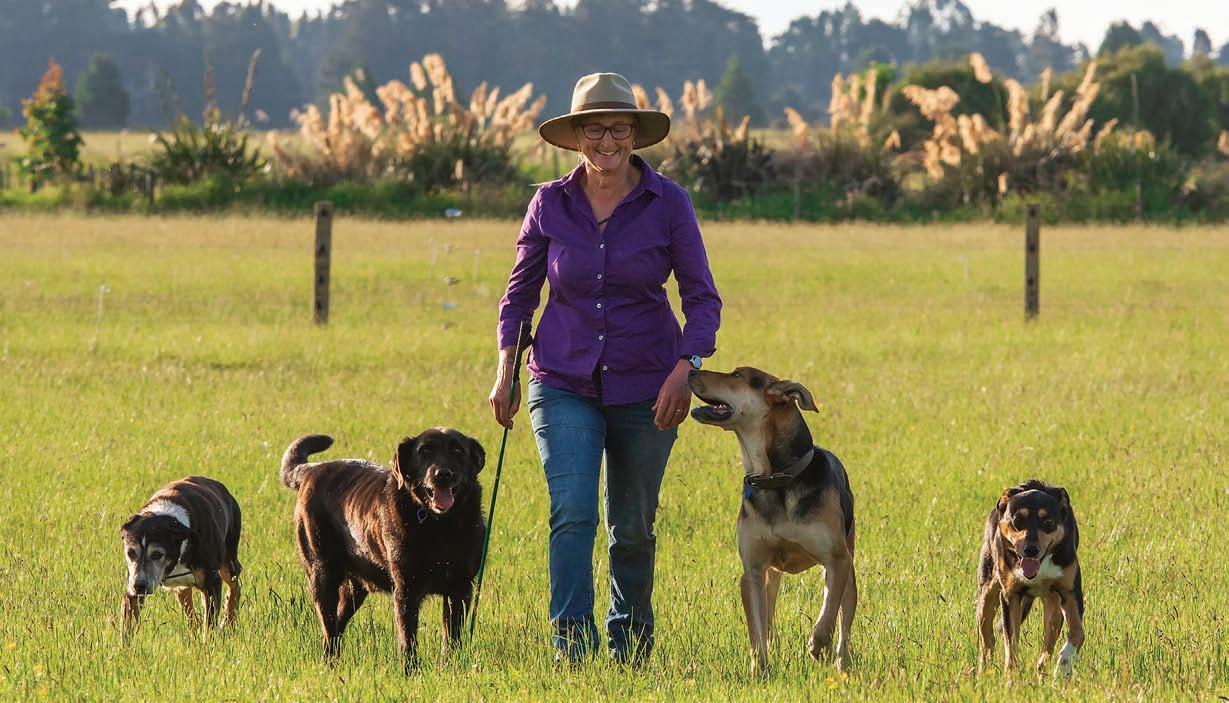 SERVICE: Volunteers throughout New Zealand work to find loving homes for working dogs who, through age, injury or temperament, have reached the end of the farming careers. Retired Working Dogs fosterer Tania Mapp is pictured with dogs Mate, Ruff, Port and Brown.