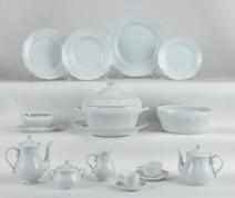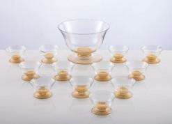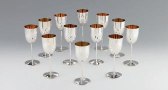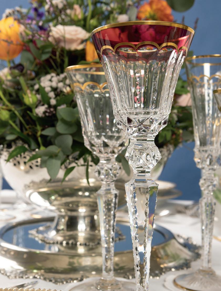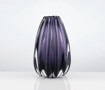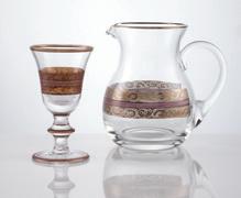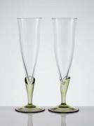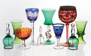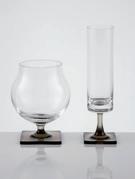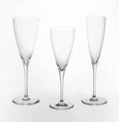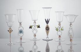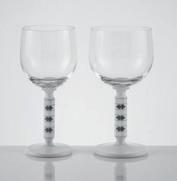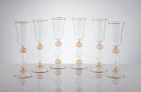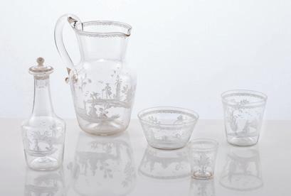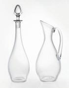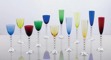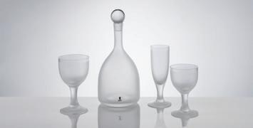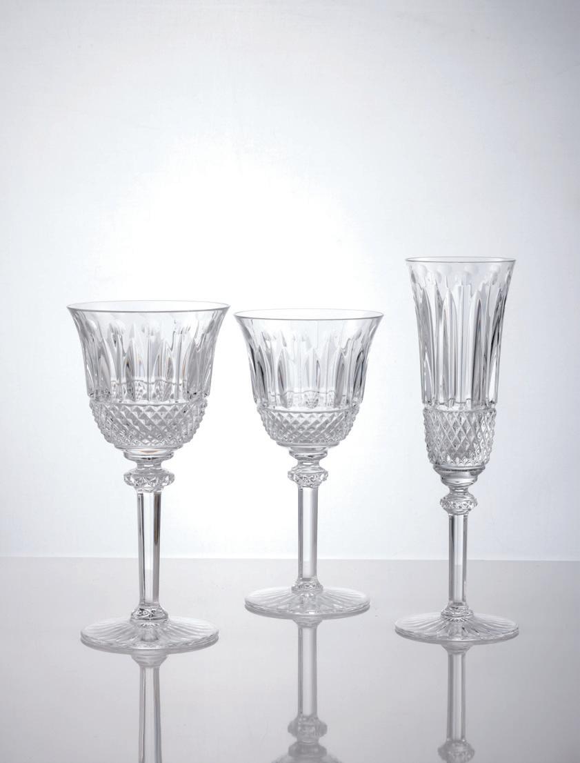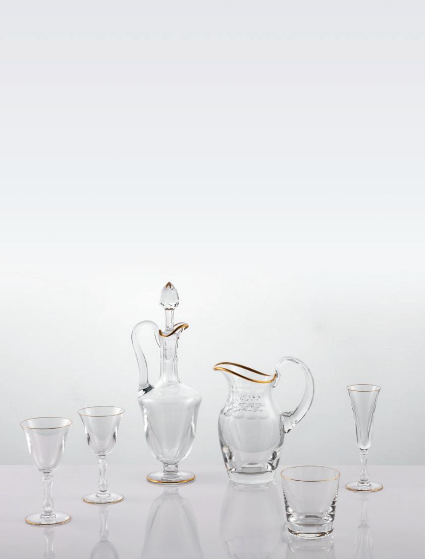 Corpo in cristallo massiccio con superficie battuta. Servizio per 12 persone composto da: 12 calici acqua (cm. 16,1 h.), 12 calici vino (cm. 14 h.), 12 flûte (cm. 18,3 h.) e 1 bottiglia con tappo (cm. 30 h.).