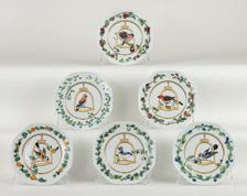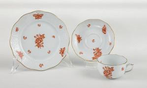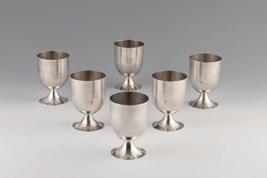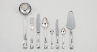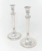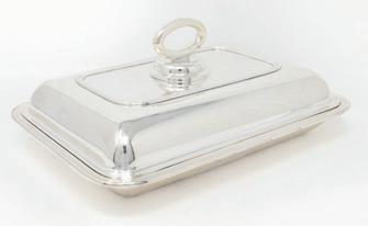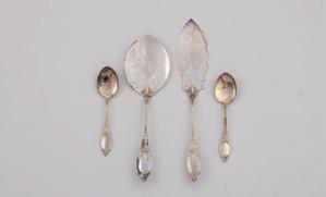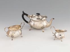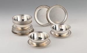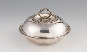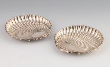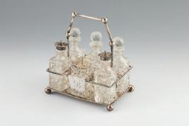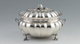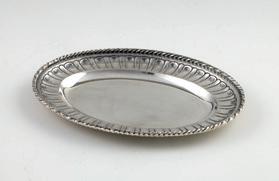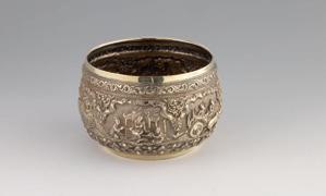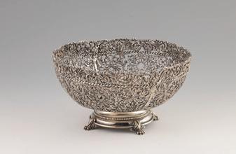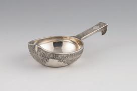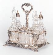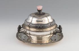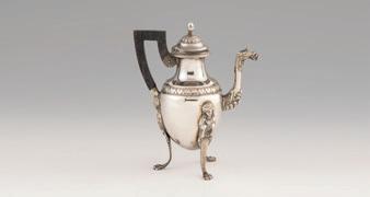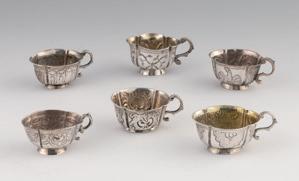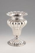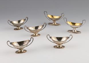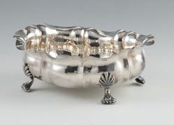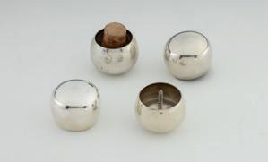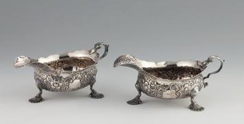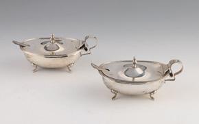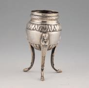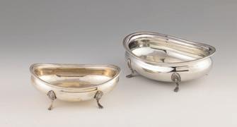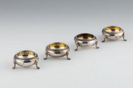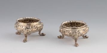 Corpo circolare, decoro a rilievo con volute vegetali, bordo mosso, tre piedini con finale a ricciolo, cm. 5,5x8,5 ø ognuna, peso g 380, punzoni di Londra, 1818.