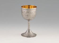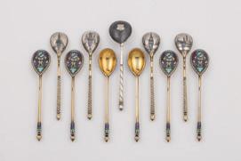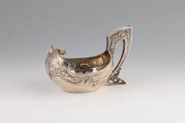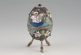 Corpo finemente cesellato, decoro in smalto policromo cloisonné con motivo raffigurante cigni a rilievo, fiori e granati cabochon, interno vermeille, tripode con zampe equine, cm. 9 h., peso g 143, punzone dell’argentiere H3 (attendibilimente Ivan Zakharov), punzoni di Mosca, 1908-17.