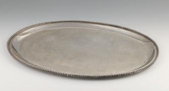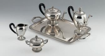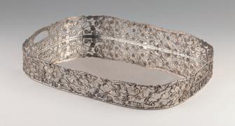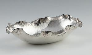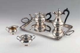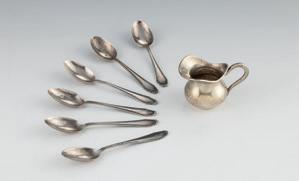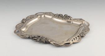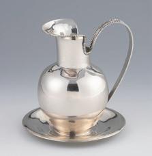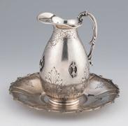 Brocca con corpo ovale decorato a motivi vegetali e applicazioni in rilievo, cm. 17 h., piatto rotondo con bordo mosso e decoro con incisioni, cm. 21,5 ø; peso g 595.