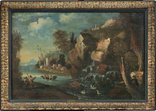 Paesaggio fluviale con barca e figure