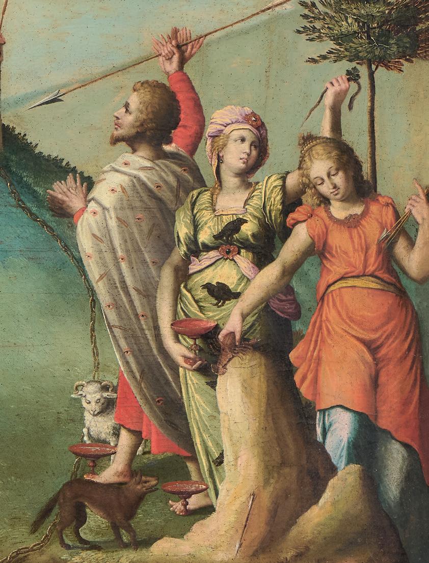 Questi due dipinti, in relazione all’altro pendant con soggetti tratti dalla Gerusalemme Liberata (lotto n. 69), che raffigurano Diana sorpresa da Atteone e L’infanzia di Giove, corrispondono a due dei soggetti più celebrati dalle fonti antiche e nella pittura di cultura classicista.