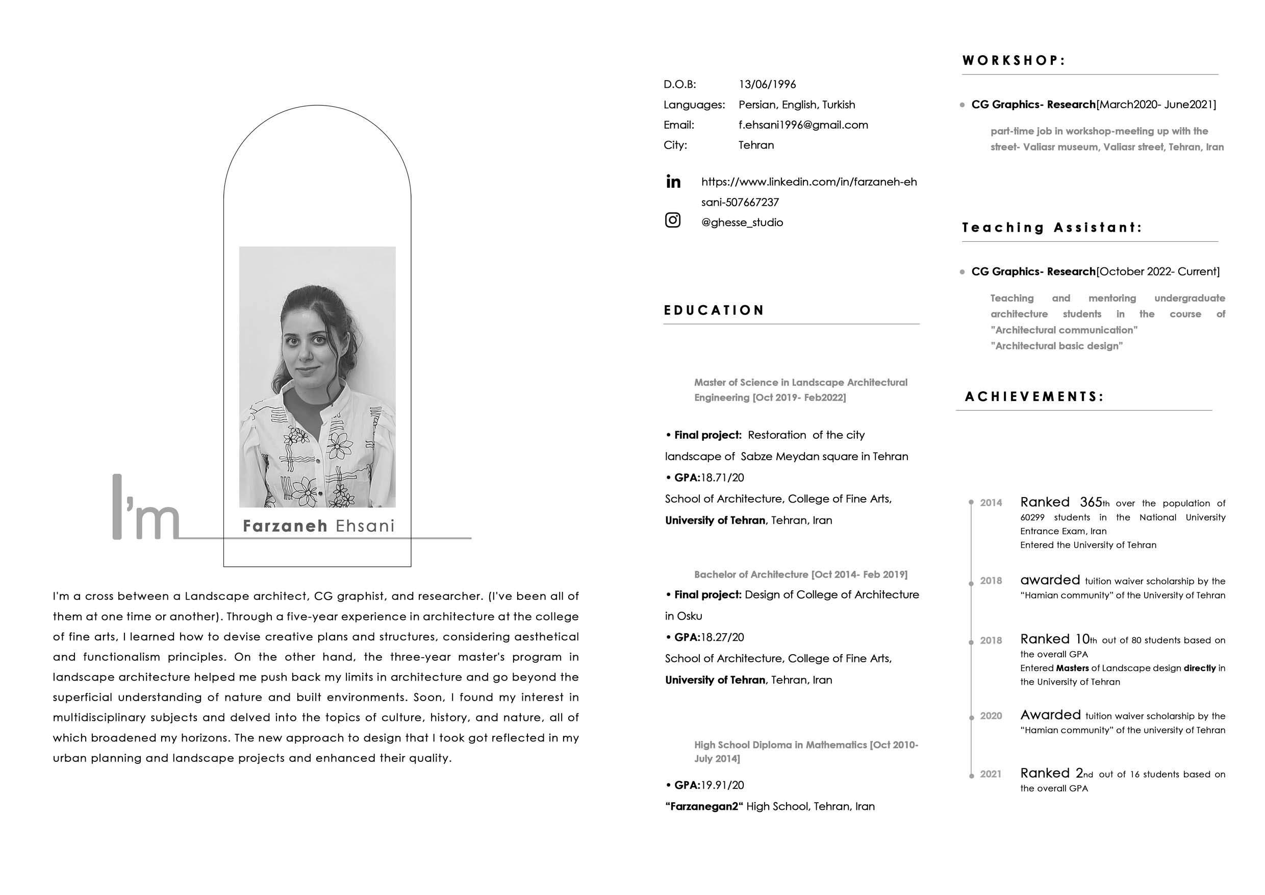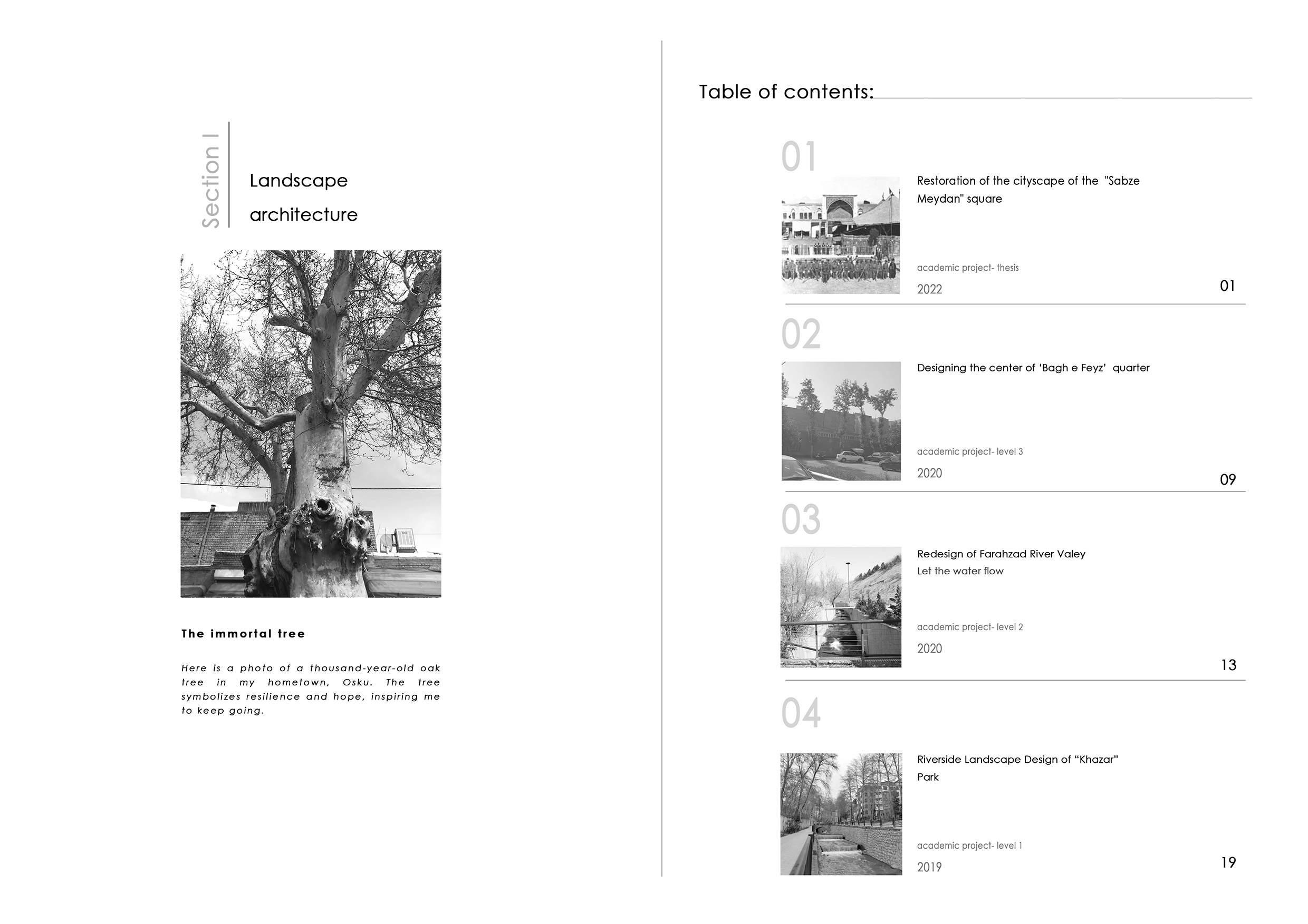 I hope you enjoy seeing a flip-through of my portfolio, which includes my best architecture, landscape & urban designs. Most of the pages are from my academic projects throughout my eight-year journey at the University of Tehran(2014-2022). In this portfolio, you will find a glimpse of my life, in which I experienced a combination of bitter and sweet circumstances that somehow shaped my personality.