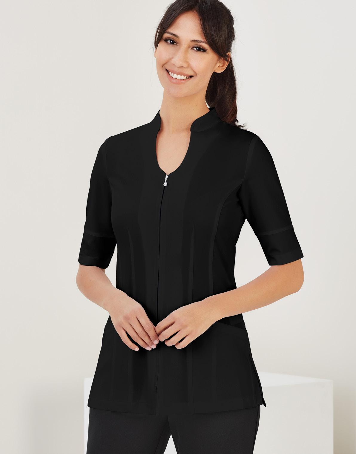 Biz Collection Bliss tunic, with Dupont™ Teflon ® stain release stretch fabric. Semi-fitted with side splits, longer length vented sleeves, 2 way zip with nickle free diamantè and front pockets.