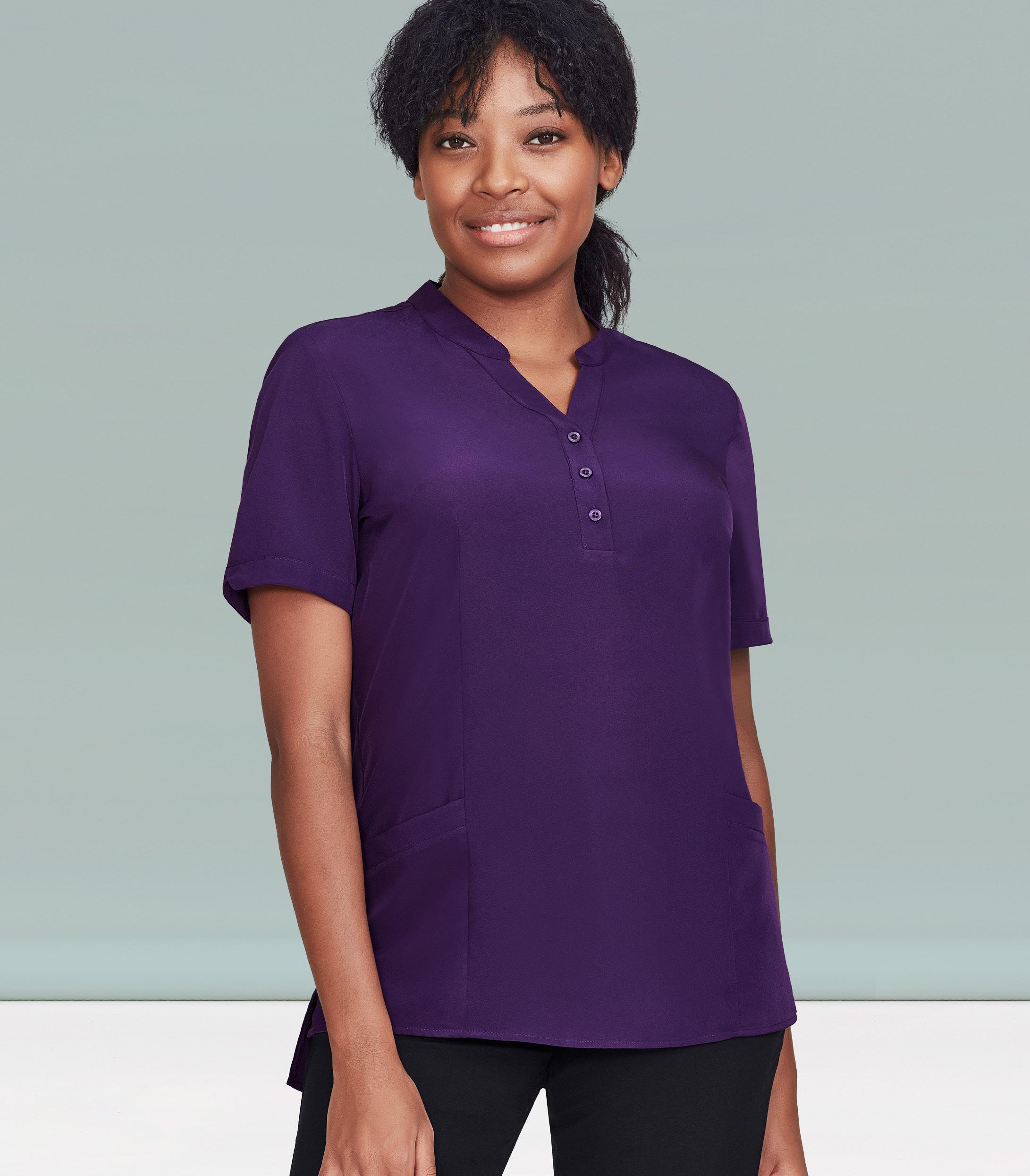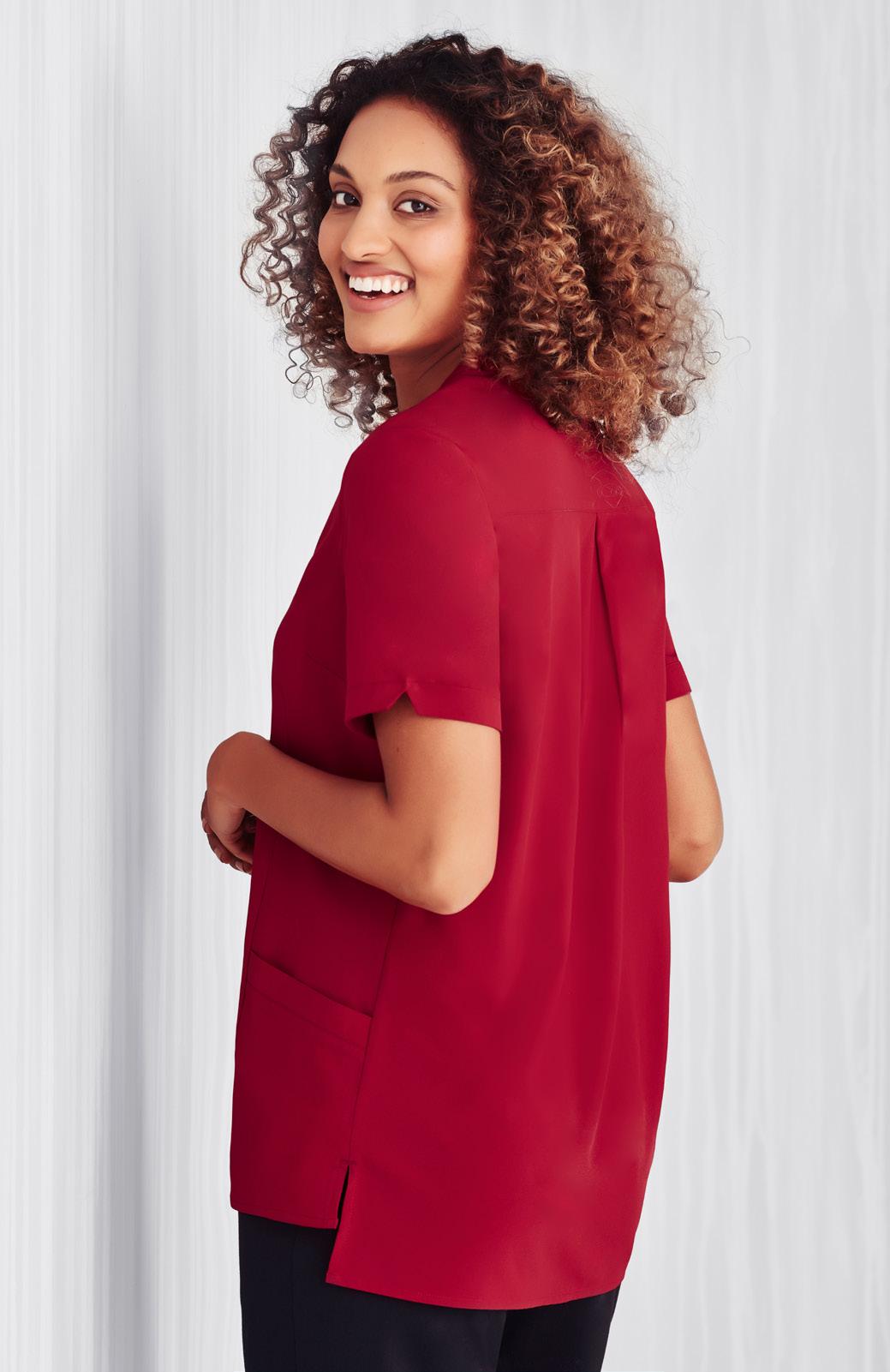 Biz Collection Eden tunic, with Dupont™ Teflon ® stain release stretch fabric. Front pockets, longer hem line, semi-fitted, side splits and center back action-back pleat.