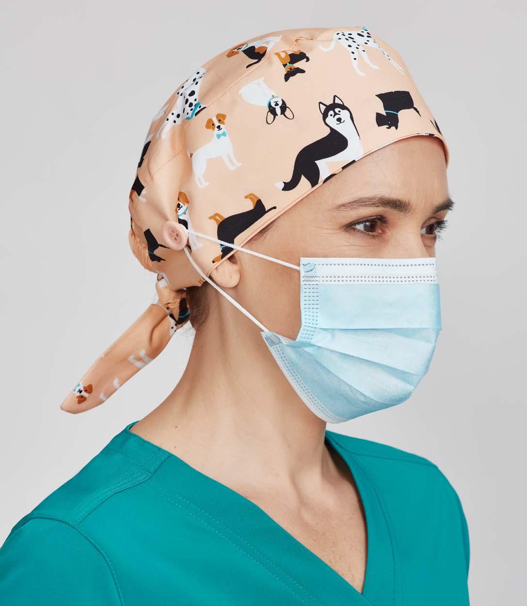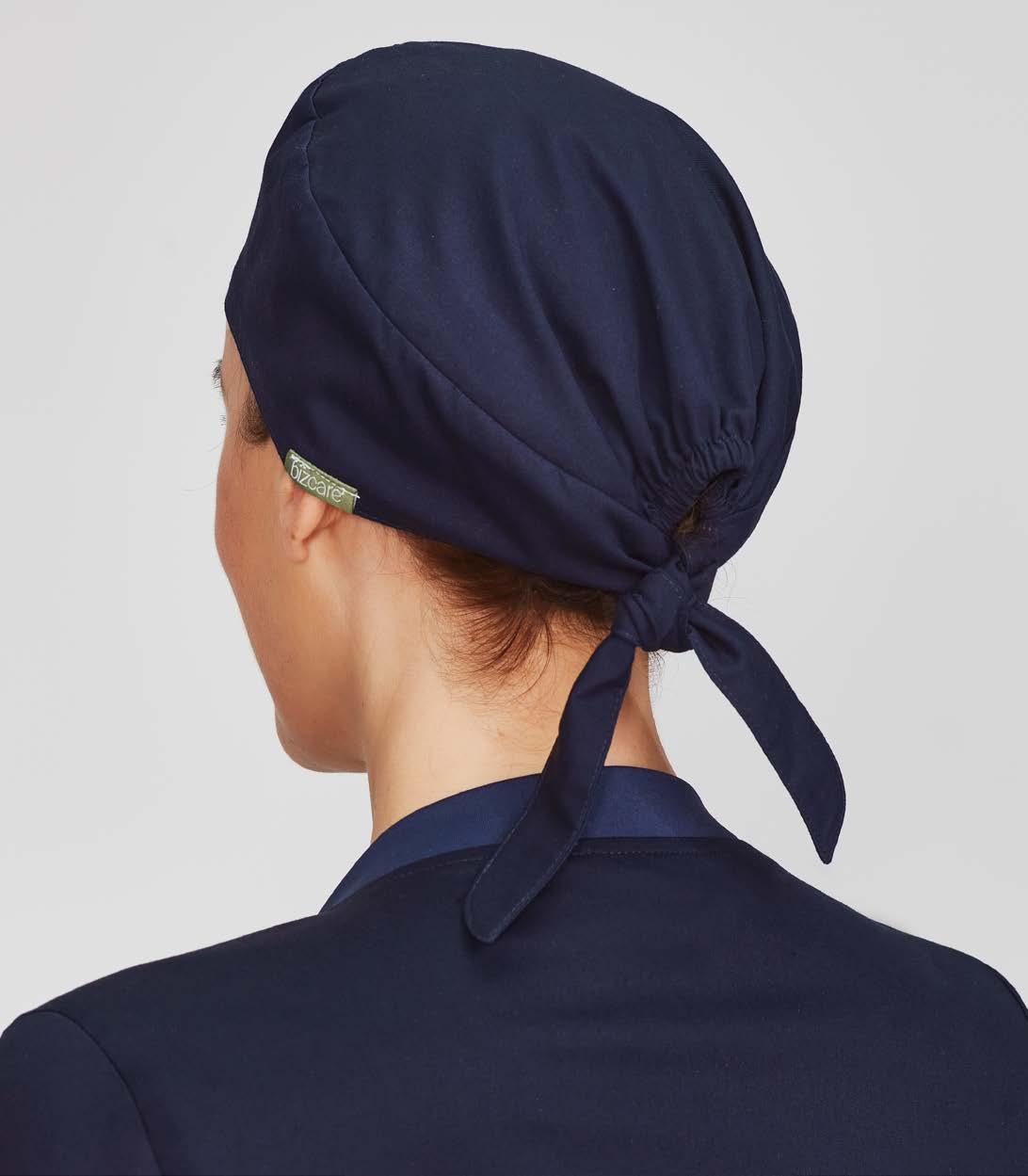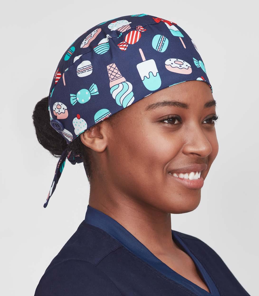 Reversible scrub caps, perfect for industrial laundering. Made from cotton blend fabric with antibacterial protection. Featuring elastic back and tie, designed to stretch easily over buns.
