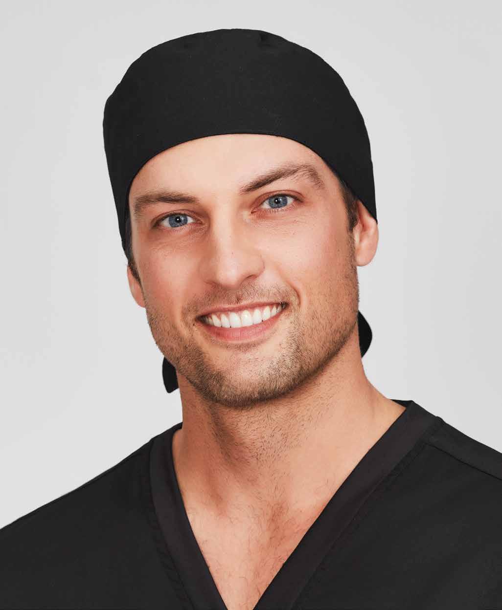 Reversible scrub caps, perfect for industrial laundering. Made from cotton blend fabric with antibacterial protection. Featuring elastic back and tie, designed to stretch easily over buns.