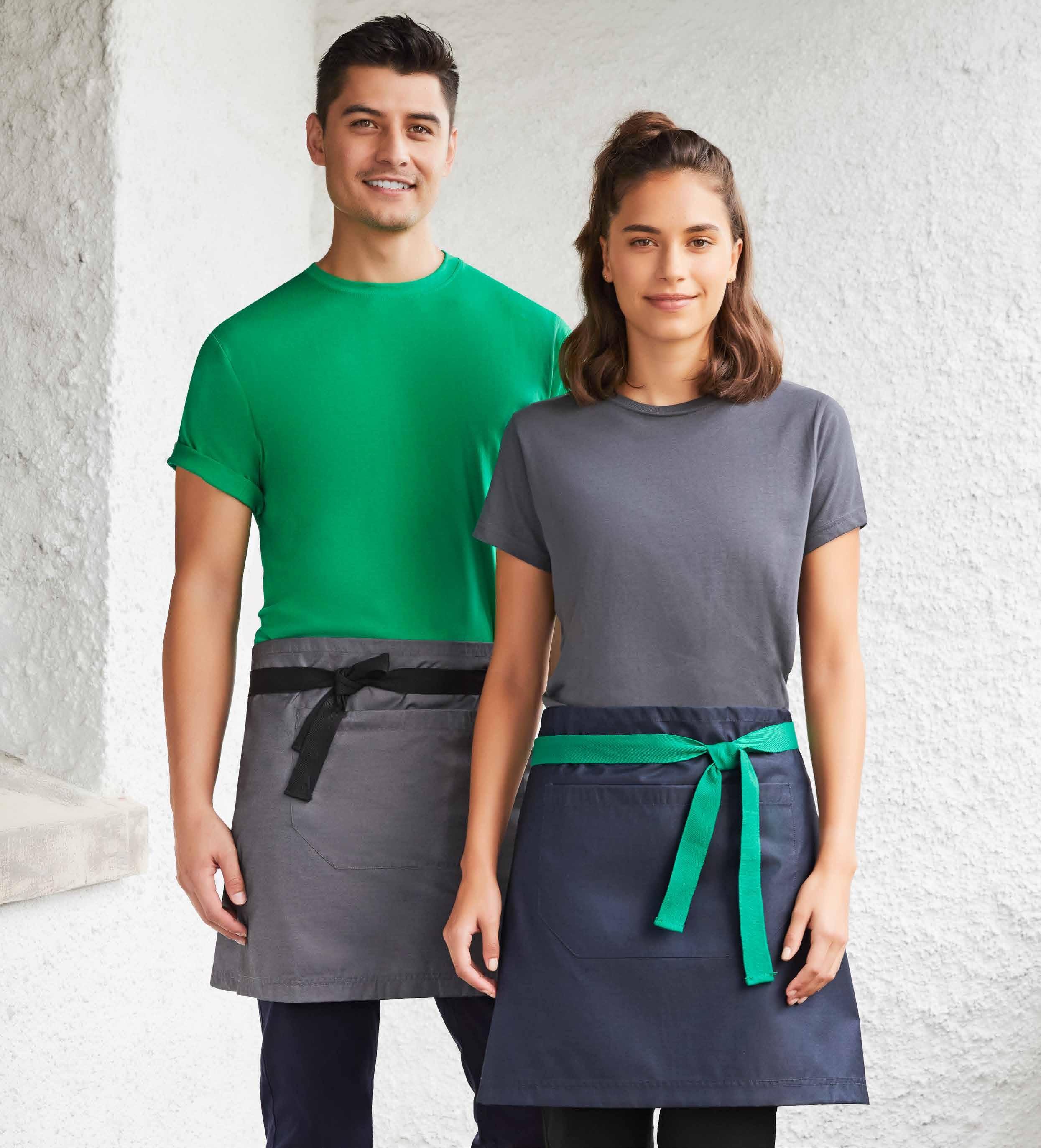FEATURES Short waisted, above the knee length • Unique styling • Towel loop at back of apron • 1 Large central front pocket with special side slide pen and bottle opener provision • Free size 86cm x 50cm