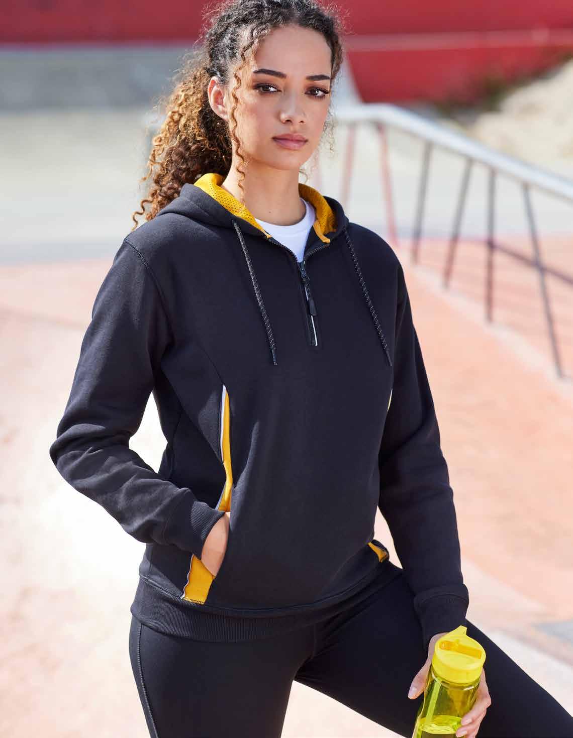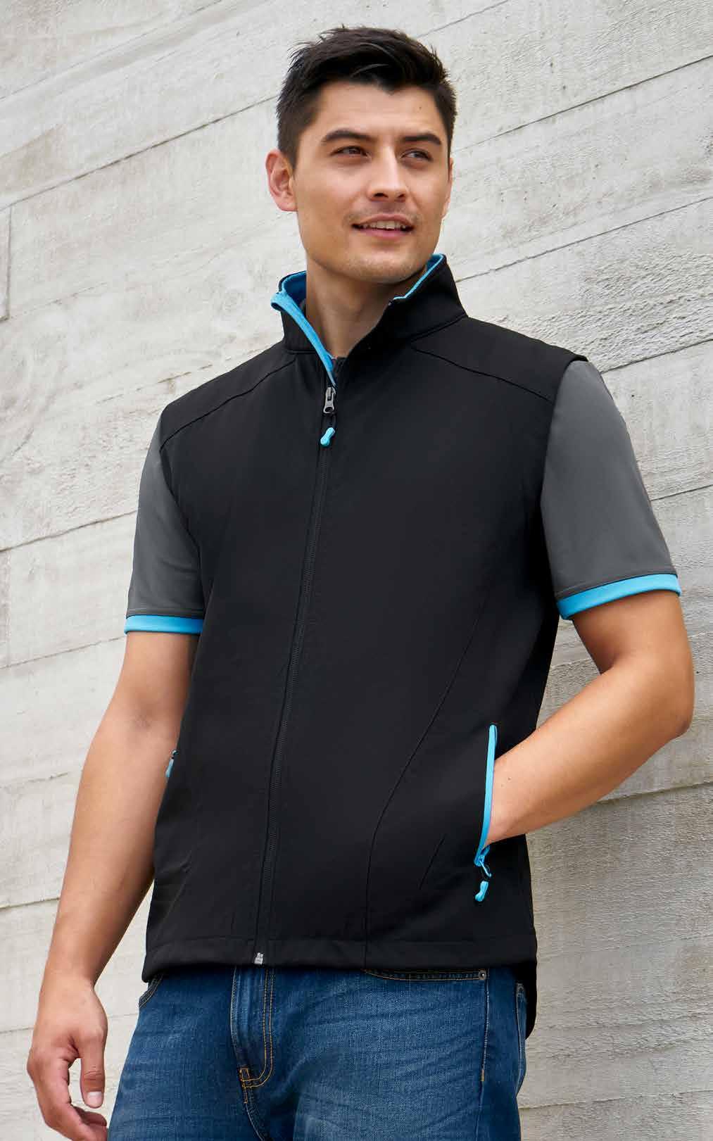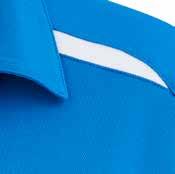 FEATURES Contrast shoulder panels and piping • Matching knitted collar • Back and underarm mesh panel inserts for breathability • Mens style includes loose pocket