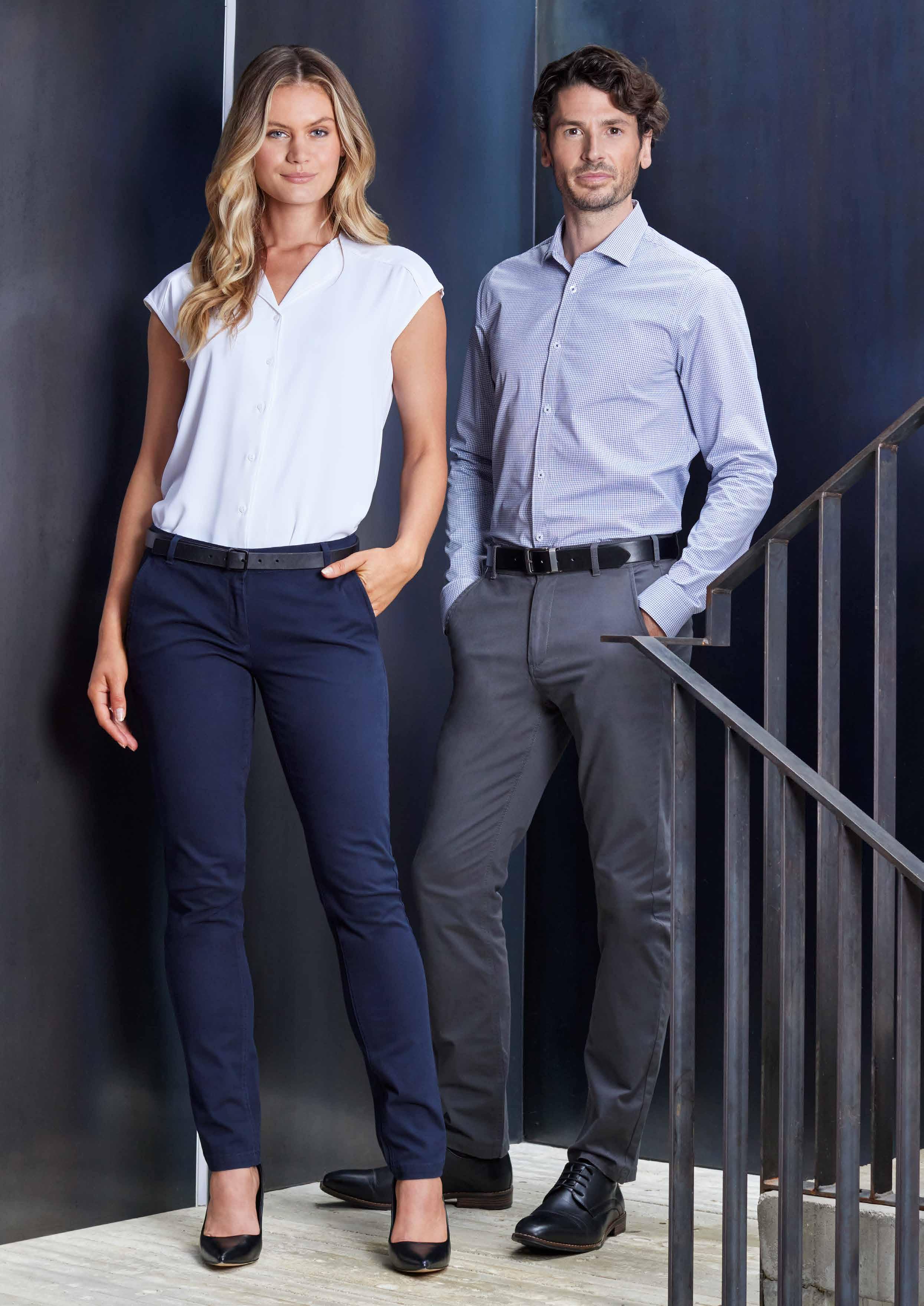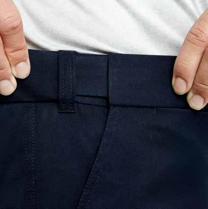 PANT FEATURES Womens fit with flat front styling • Stitch detail around pockets • 2 Front welt pockets with functional inner right pocket • Flat front with elasticated rear waistband
