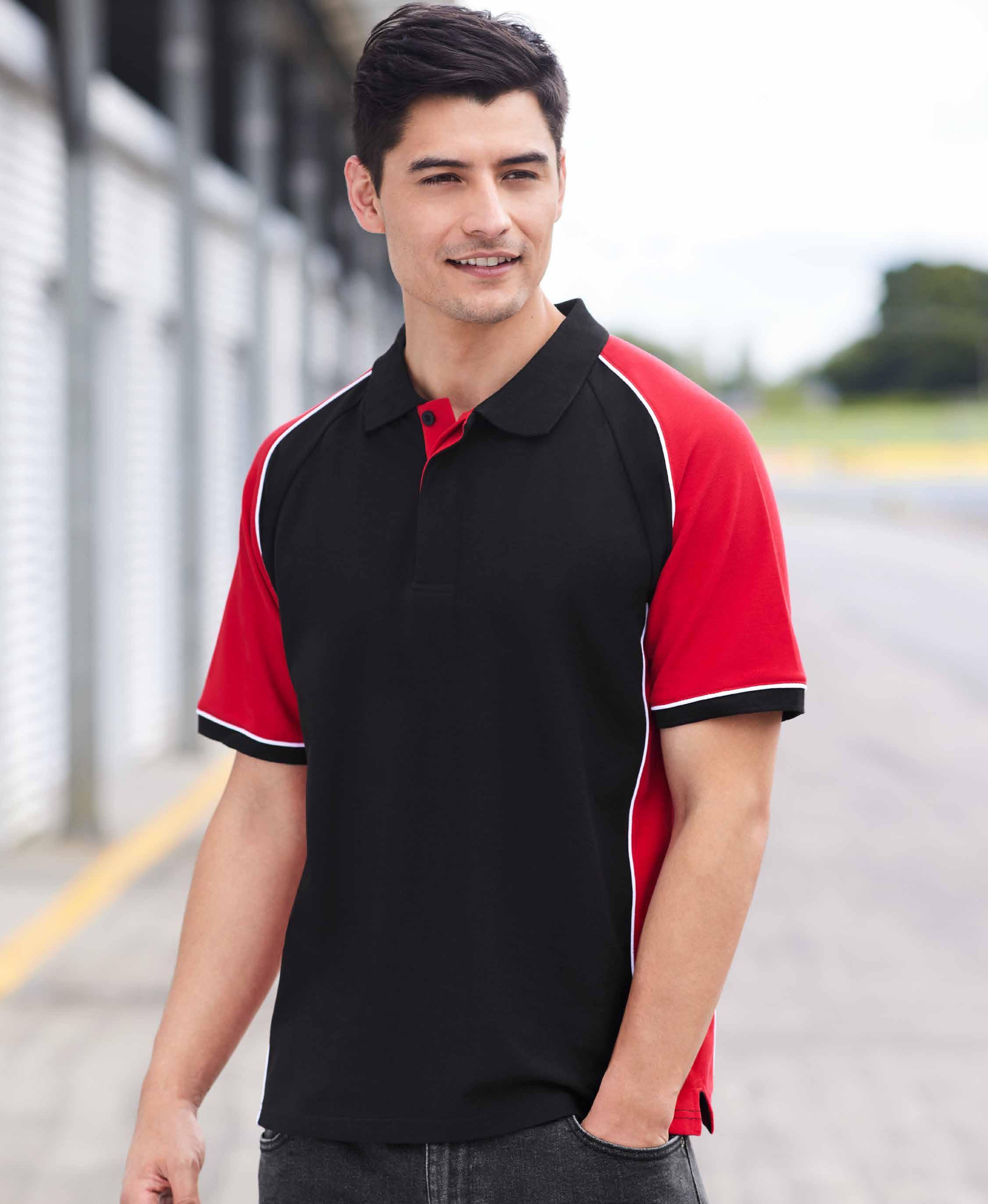 FEATURES Honeycomb weave with stretch elastane • Flat knitted collar with contrast button placket • Side panels with dynamic contrast piping • Unique print features on torso, sleeve and back neck to accent your logo • Longer length for added coverage when moving • Mens style includes loose pocket