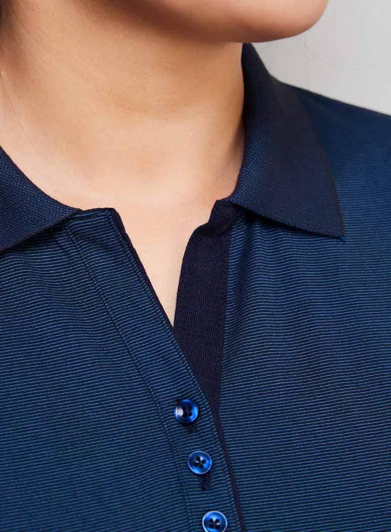 FEATURES Breathable pique knit with cotton inside, feels cool and comfortable • Knitted rib collar and 1/2 knitted sleeve cuff with contrast stripe highlights your logo • Button through piping placket • Mens style includes loose pocket