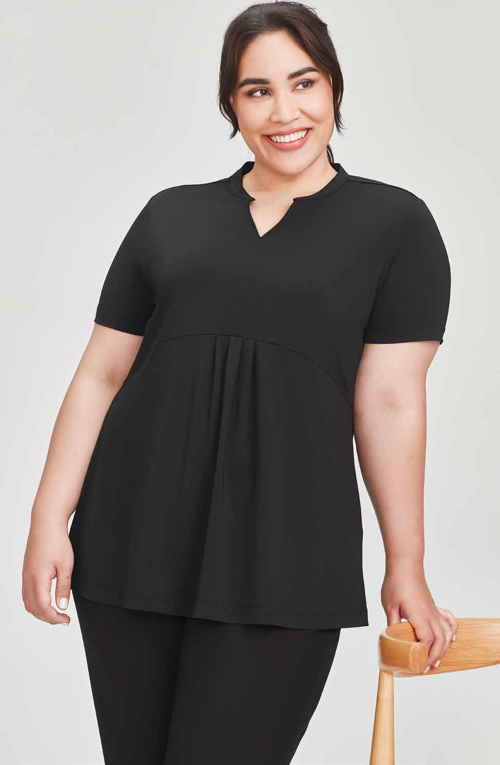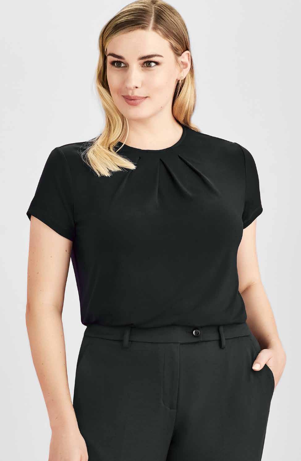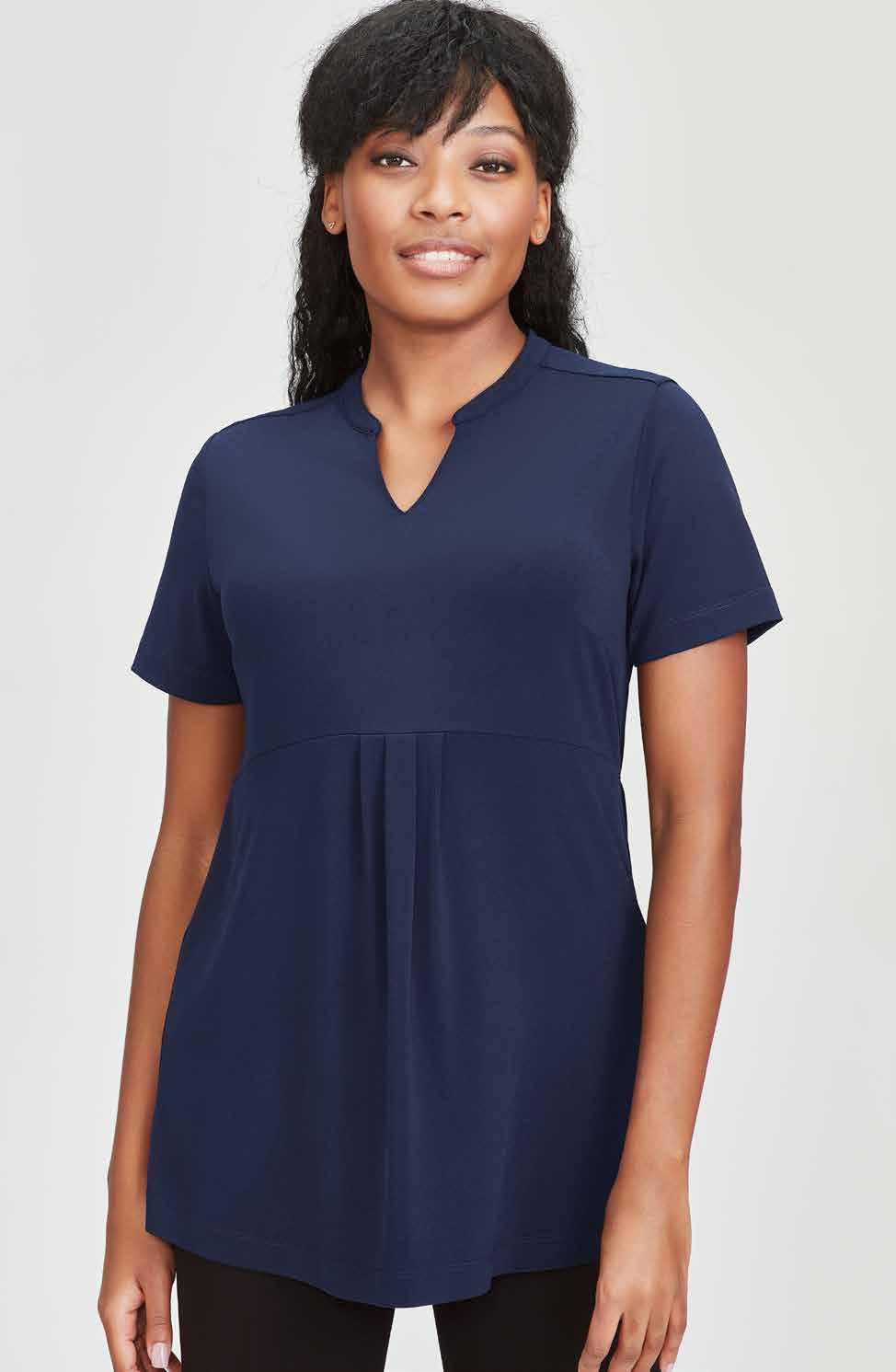 This short-sleeved style has a classic crew neckline with pleat details, it’s designed to be a semi-fitted top. Wear yours tucked in or out.