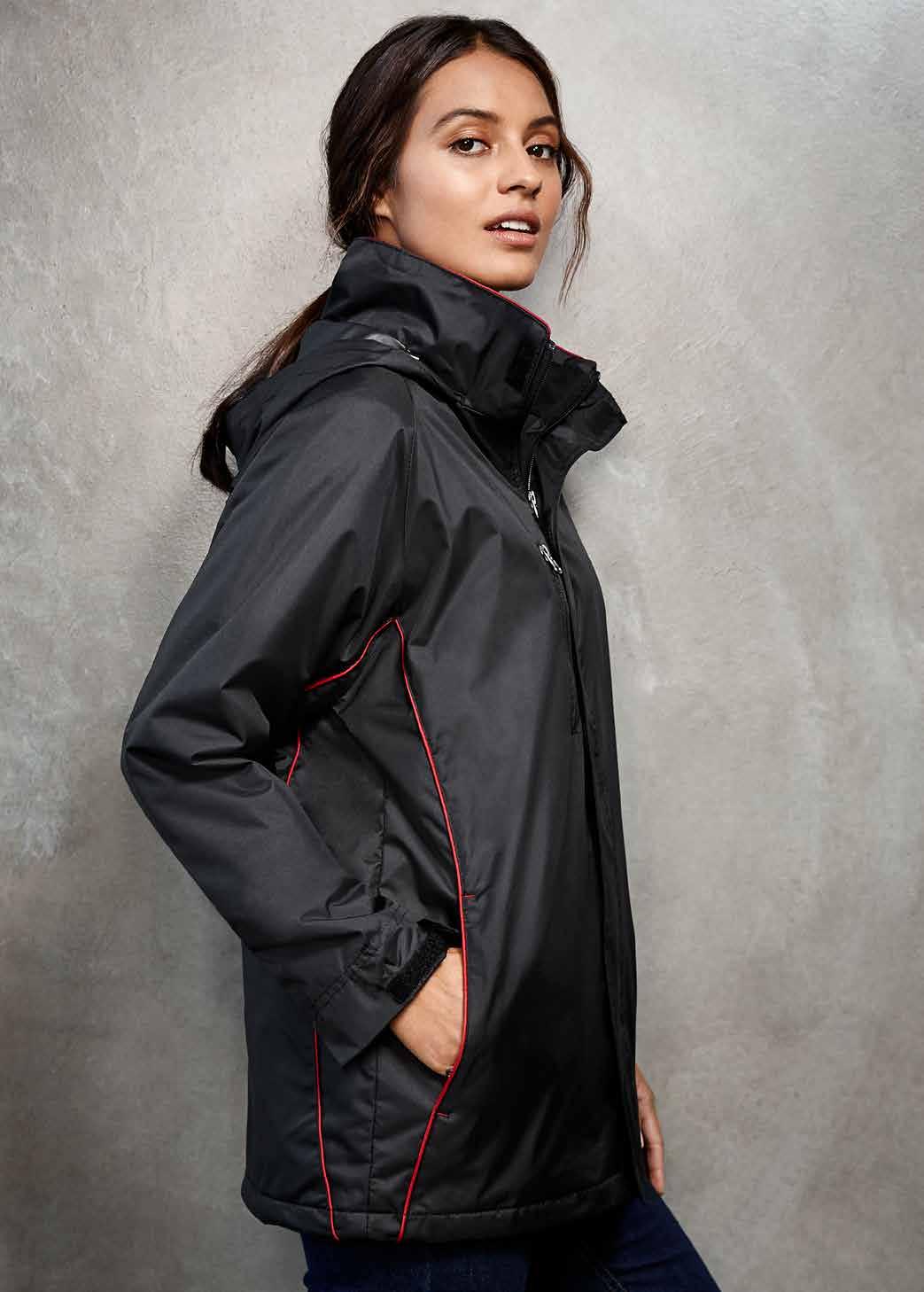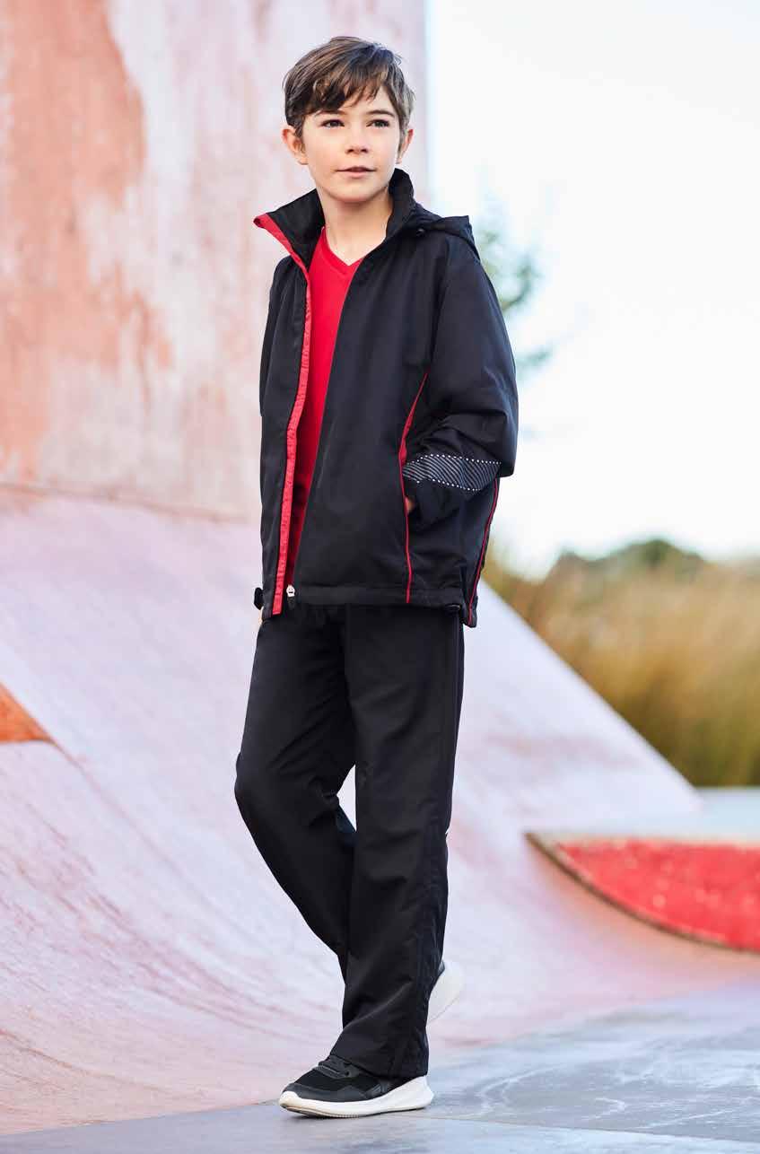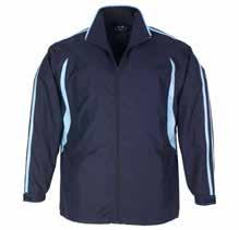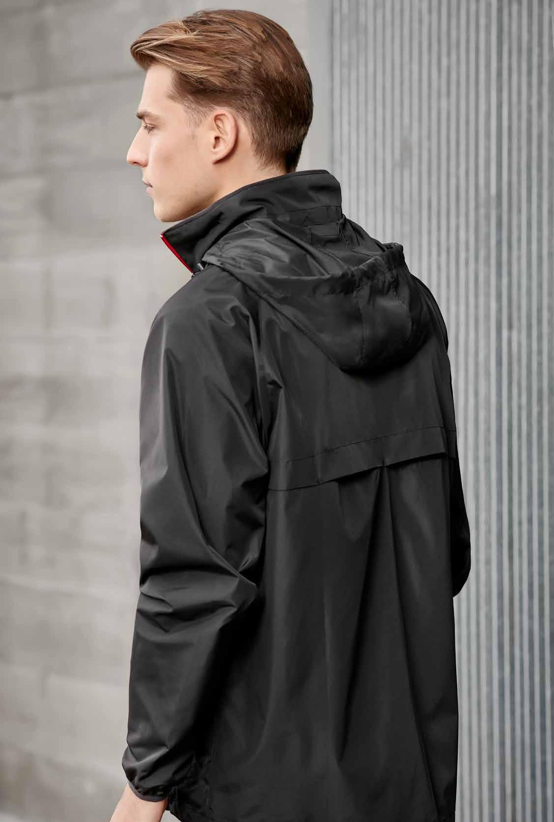 FEATURES Grid mesh underarm panels for breathability • Stow-away hood • Sleeve print feature with adjustable cuff fasteners • 2 Zippered pockets • Contrast panels, piping and inside placket