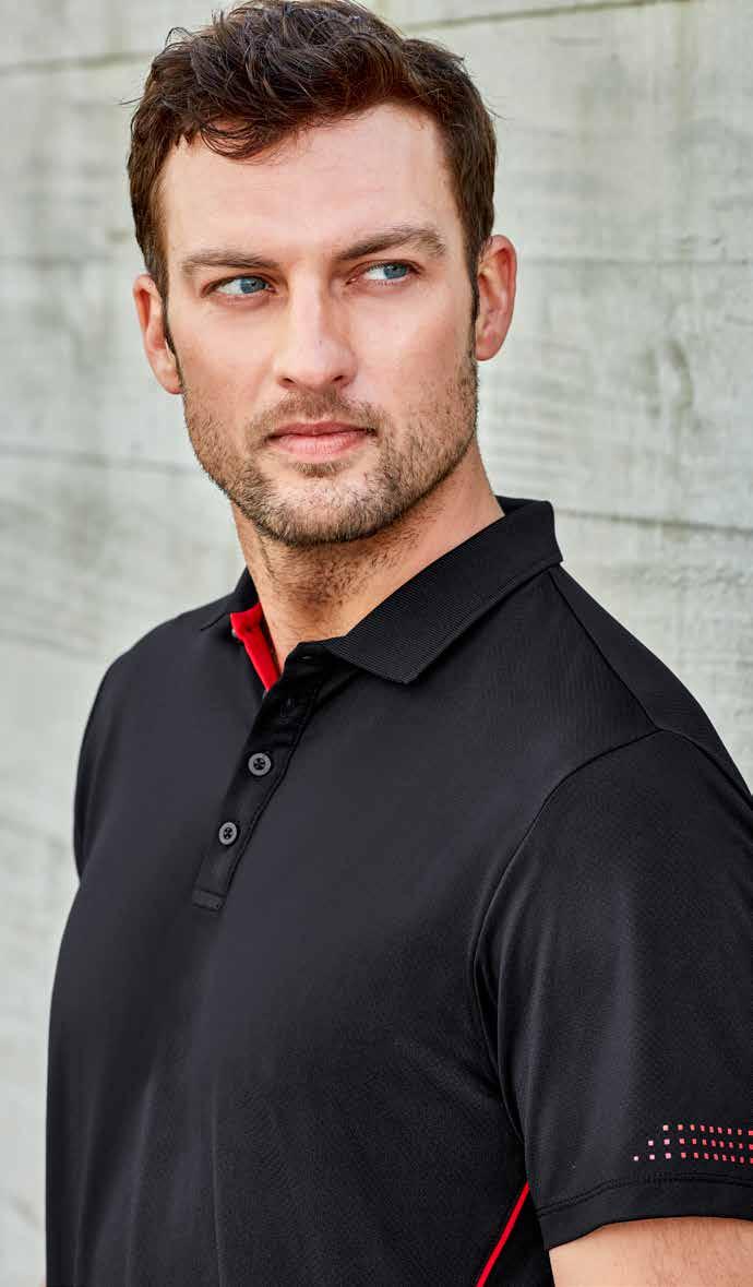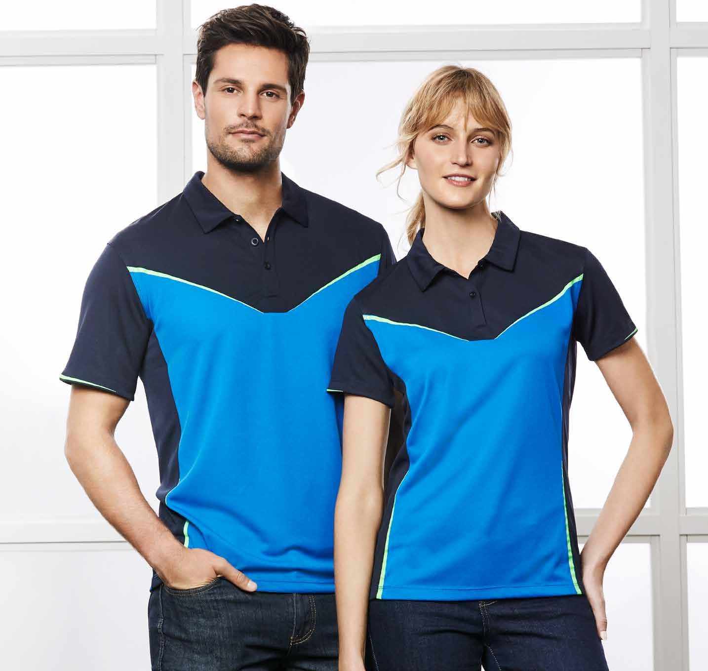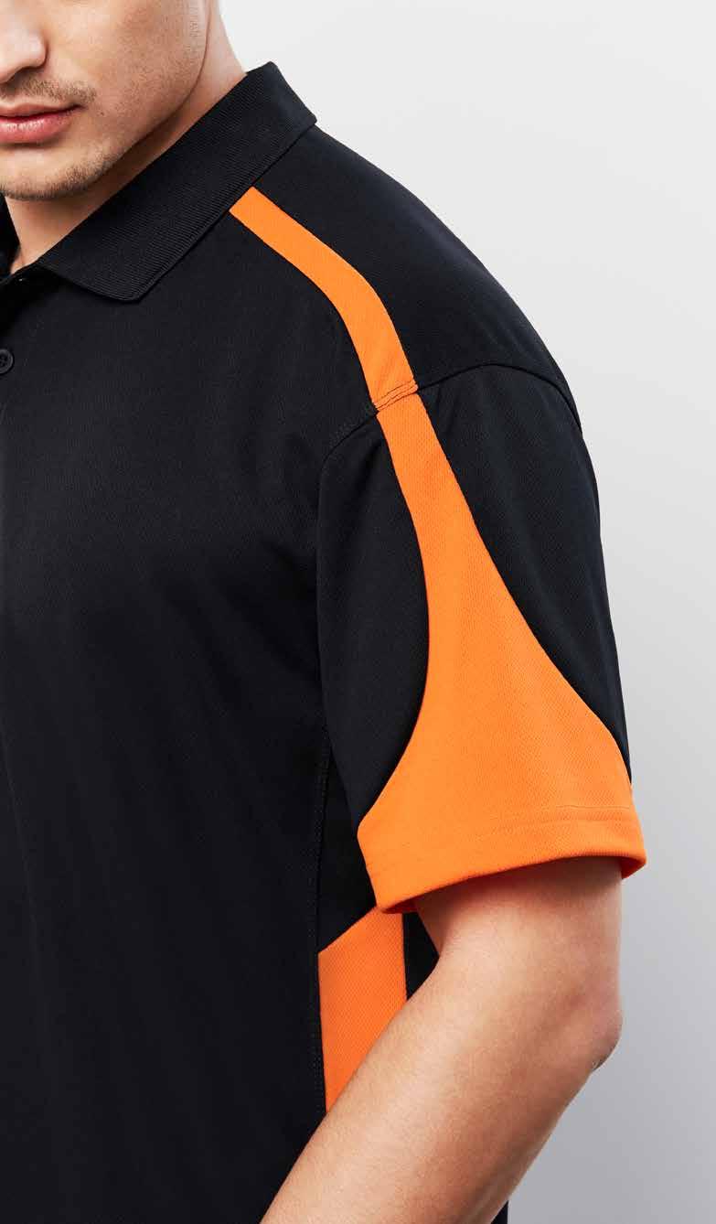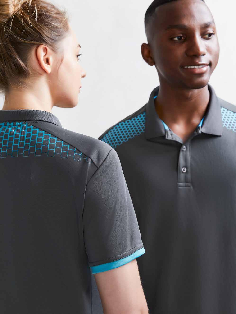 FEATURES Grid mesh underarm panels for breathability • Unique sleeve print feature • Contrast panels and piping • Knitted collar with contrast placket • Mens style includes loose pocket • *New Mens 4XL sizing available