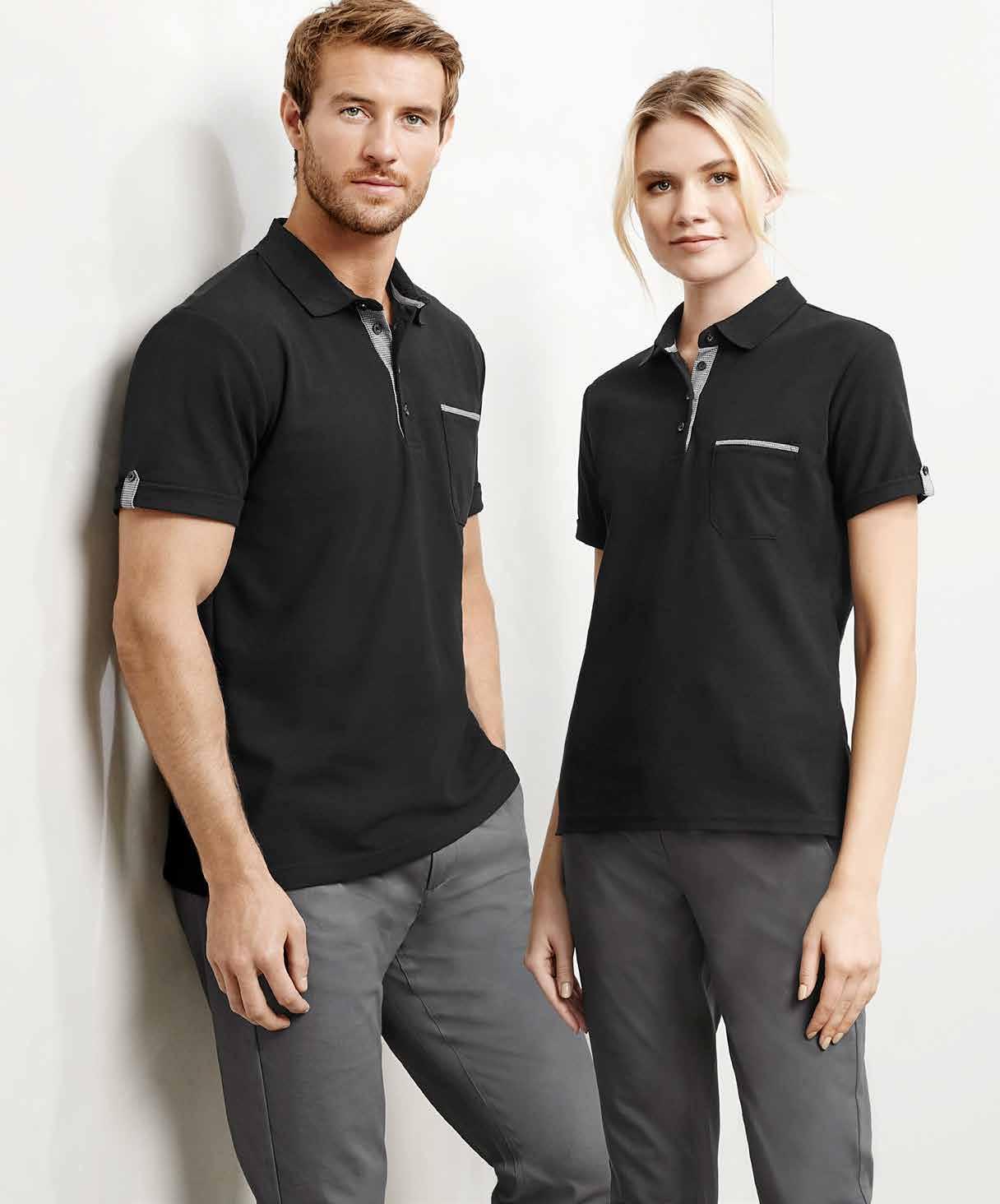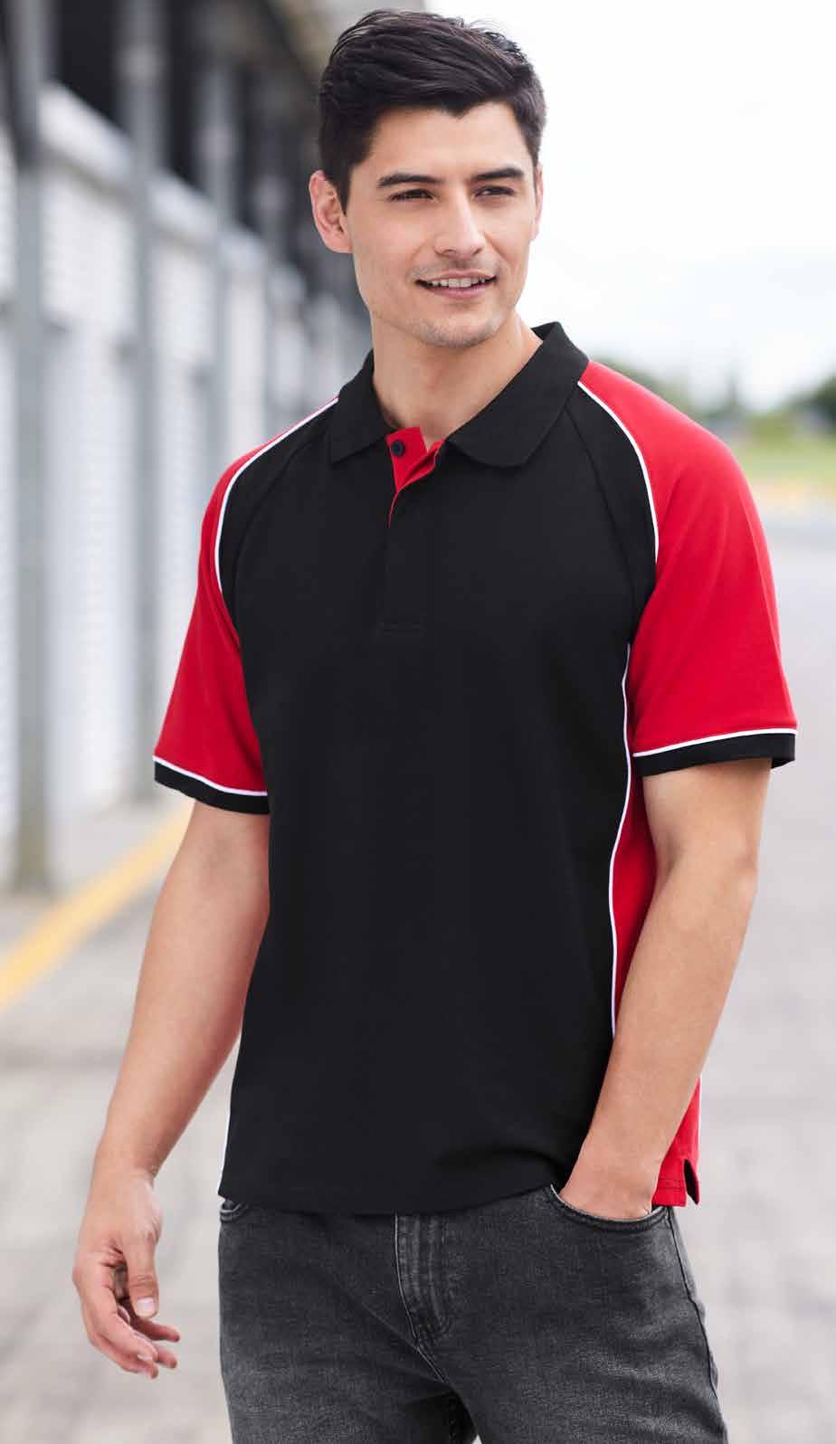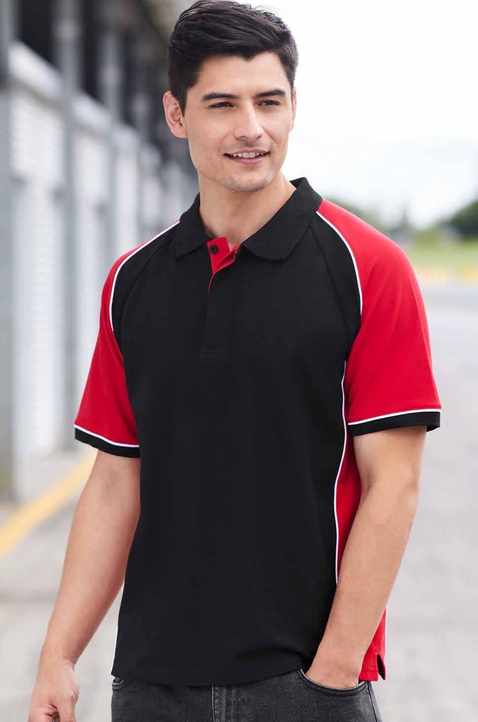 FEATURES Grid mesh underarm panels for breathability • Unique sleeve print feature • Contrast panels and piping • Knitted collar with contrast placket • Mens style includes loose pocket • *New Mens 4XL sizing available