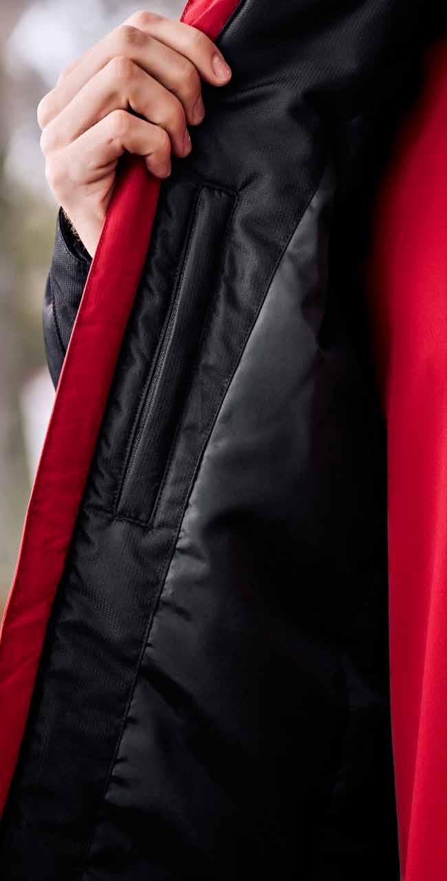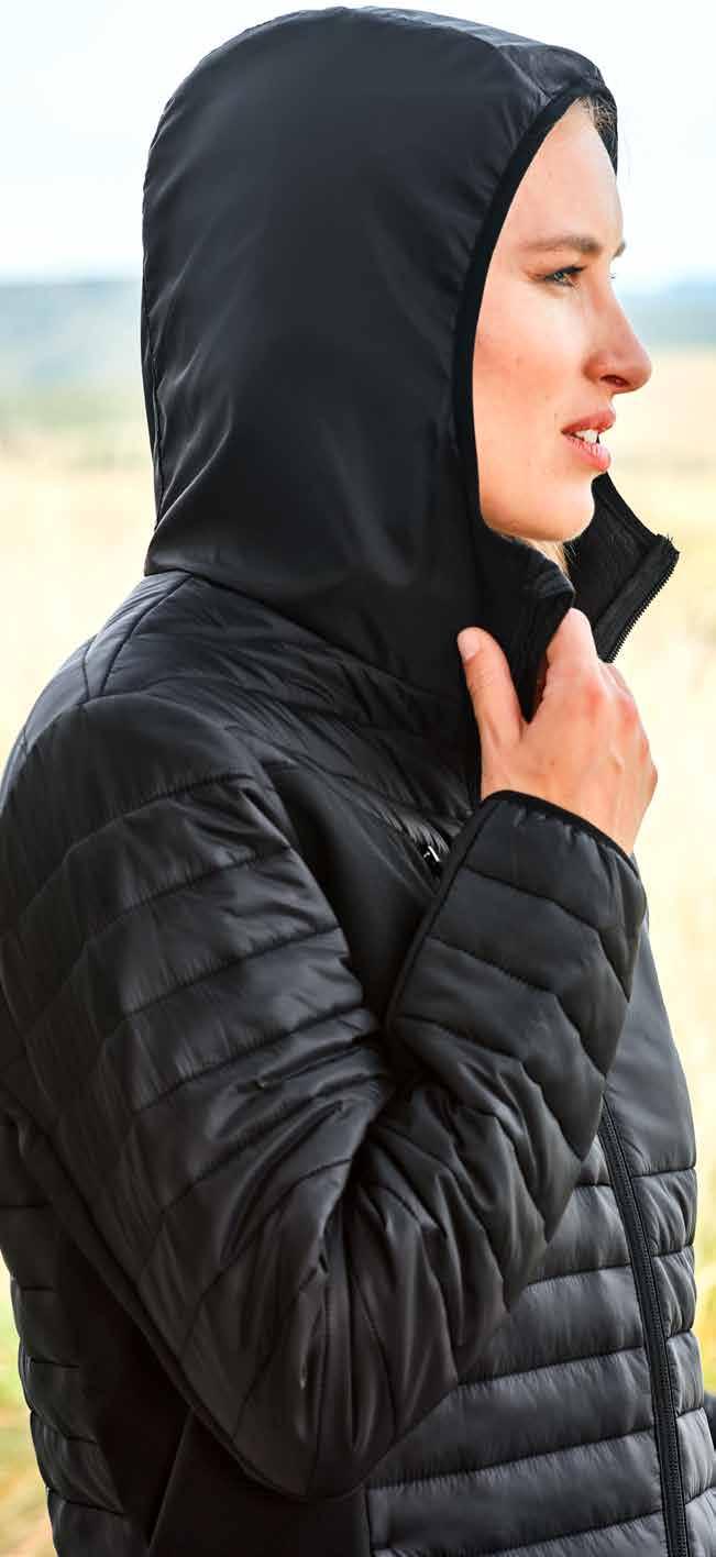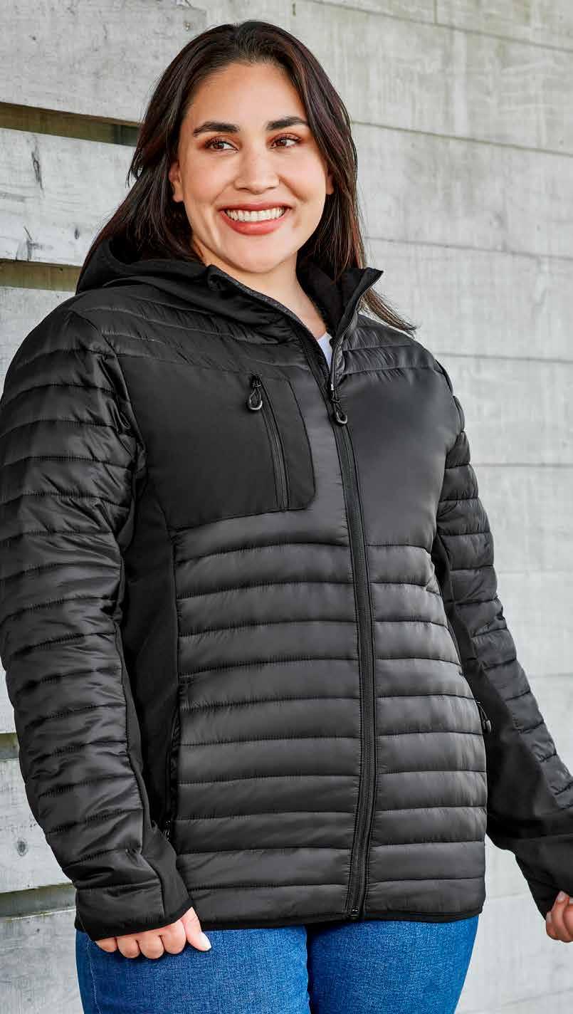 • Stowaway hood in collar • Right chest and front side zip pockets • Inner zipper access for embroidery