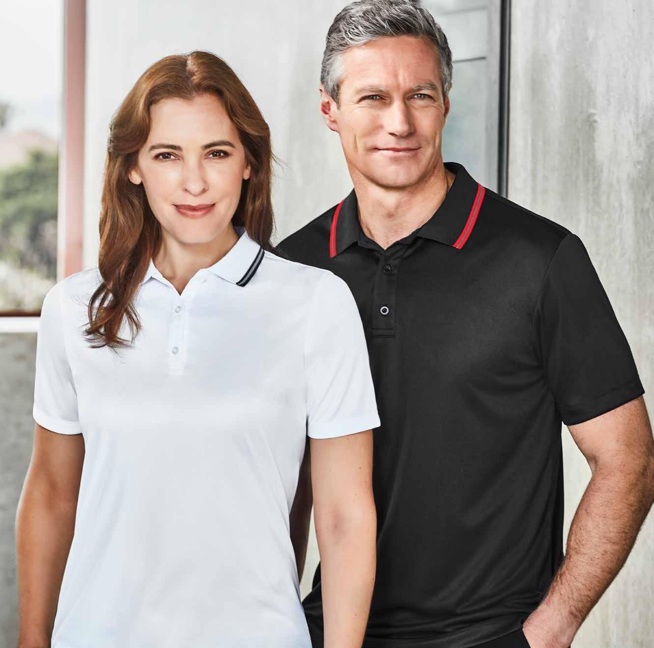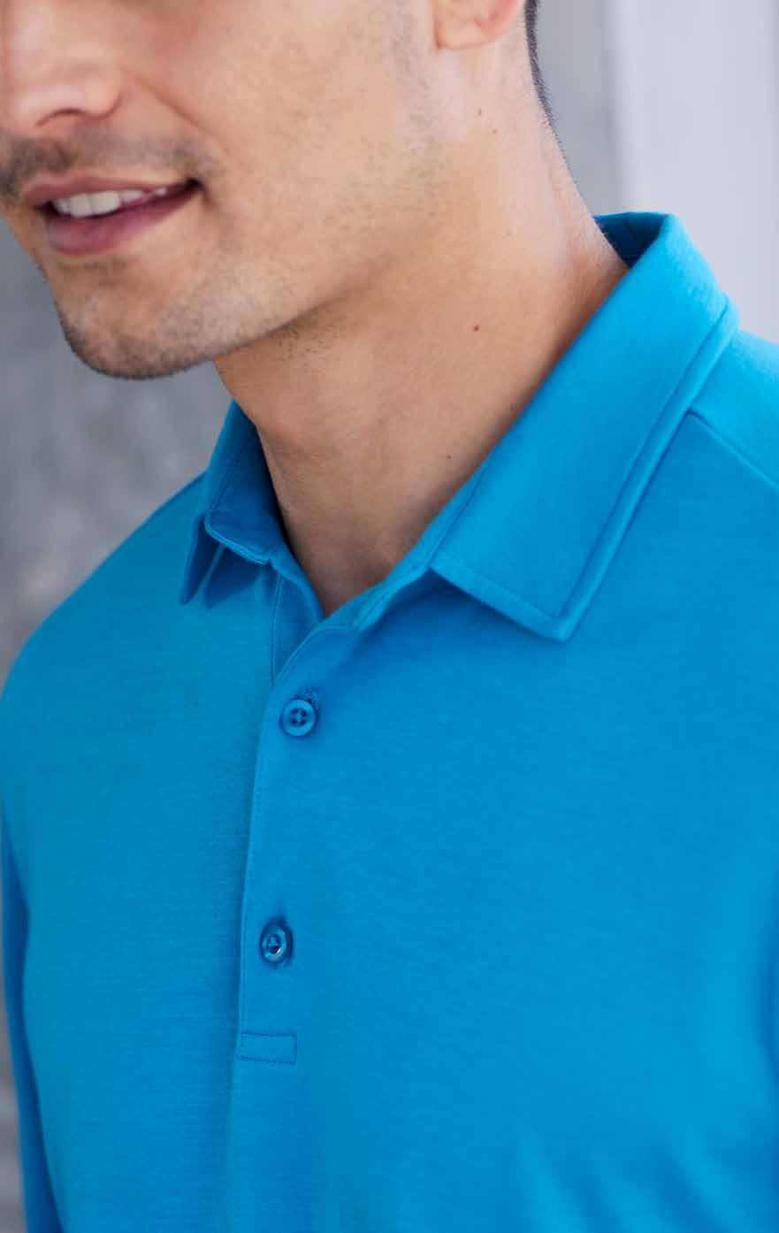 FEATURES Breathable, sweat-wicking fabric keeps you looking your best all day long • Easy-care, snag resistant durability for lasting performance • Classic flat knitted collar with 2-colour contrast tipping • 3 button placket