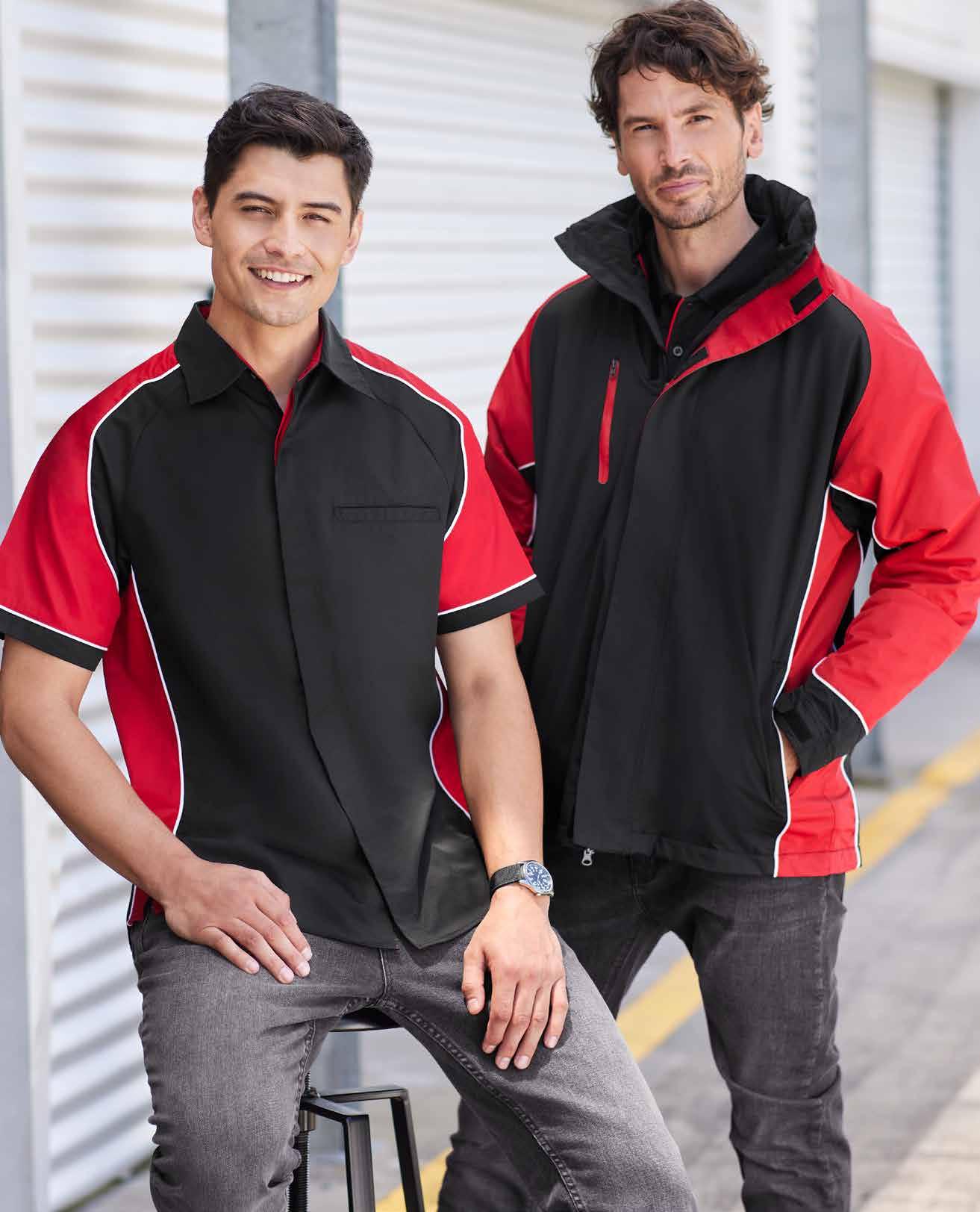 FEATURES Bold contrast panel design • Self-fabric collar and contrast sleeve cuff • Womens style features Y-line placket • Mens style includes loose pocket