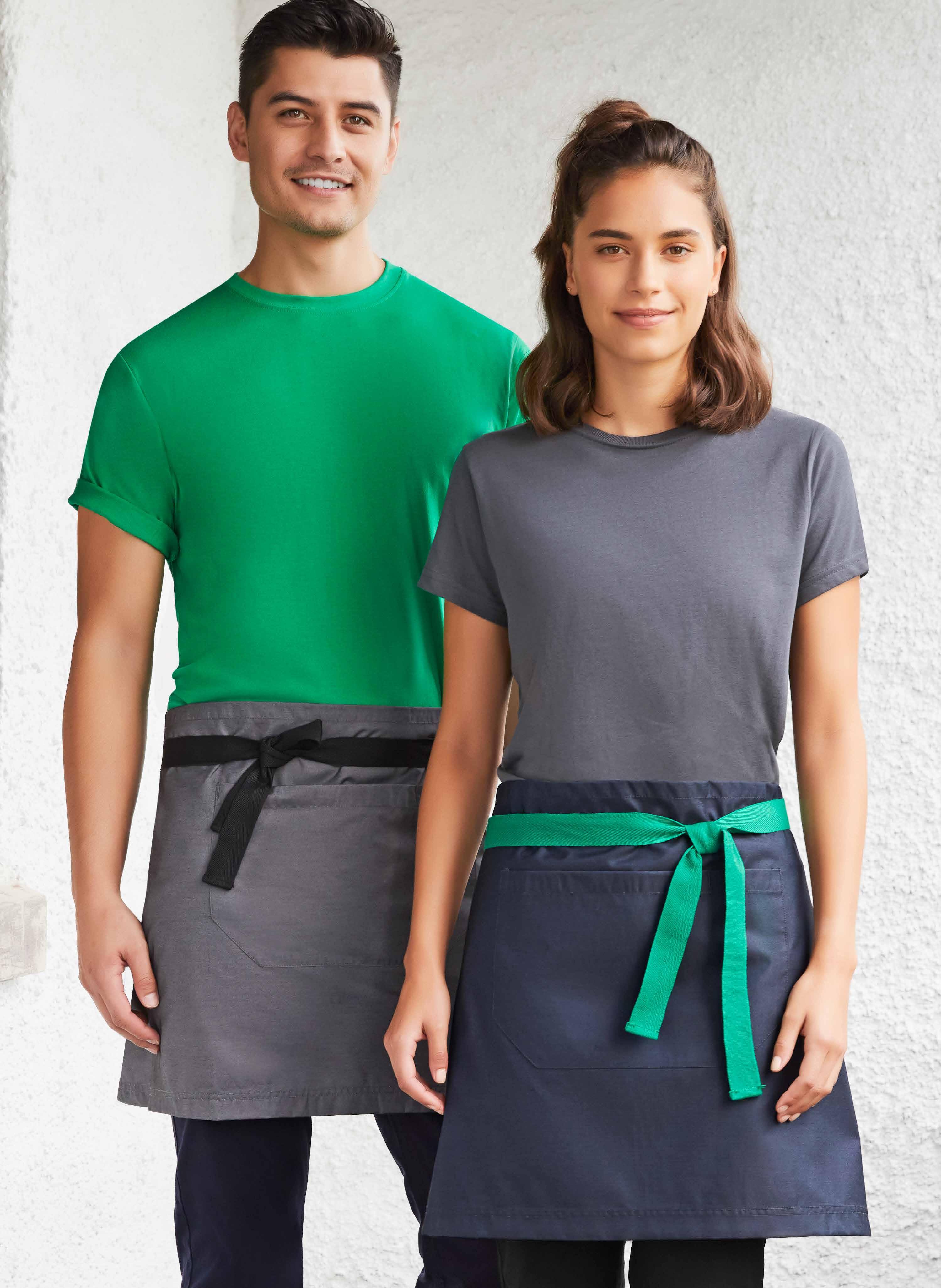 FEATURES Short waisted, above the knee length • Unique styling • Towel loop at back of apron • 1 Large central front pocket with special side slide pen and bottle opener provision • Free size 34in x 20in