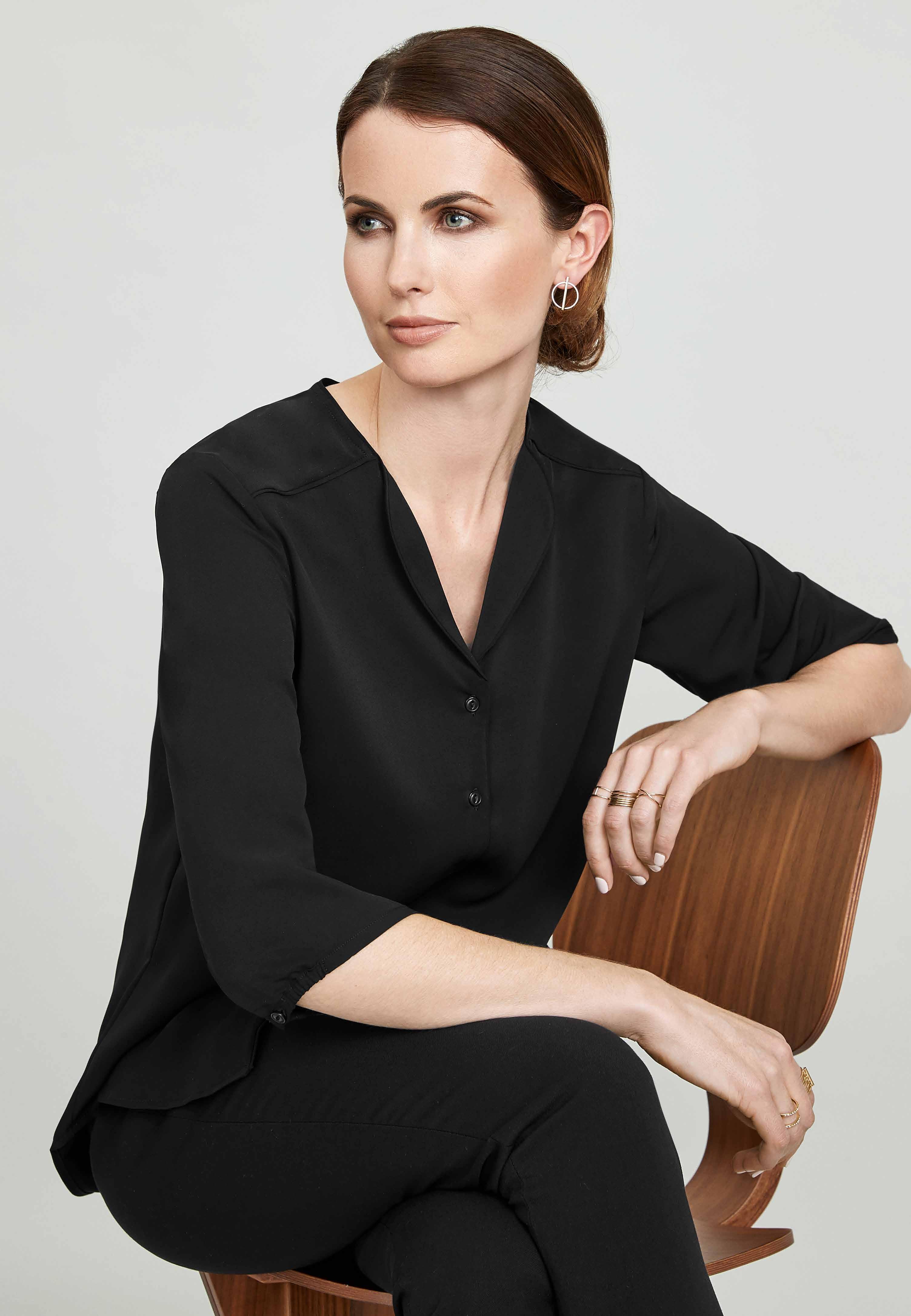 A classic collarless button-through tunic design for the stylish professional. Open notched neckline, action back pleat and front hip pockets delivers functional beauty at its best.