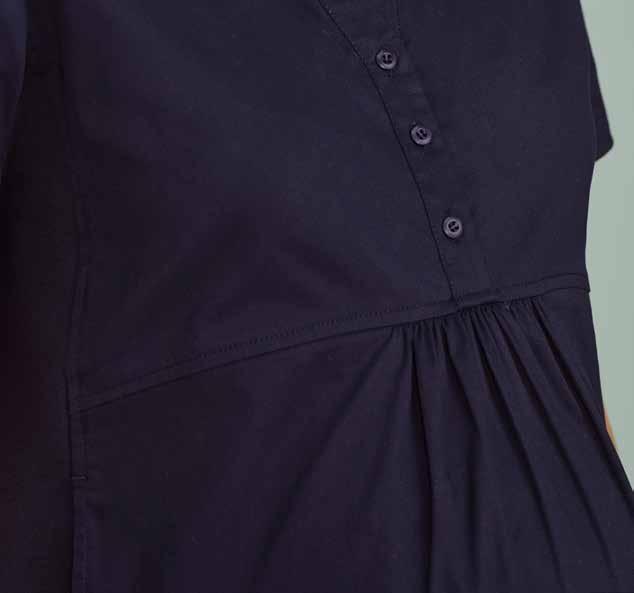 FEATURES Semi-fitted button through wrap over styling • “V” Shaped neck with mandarin collar