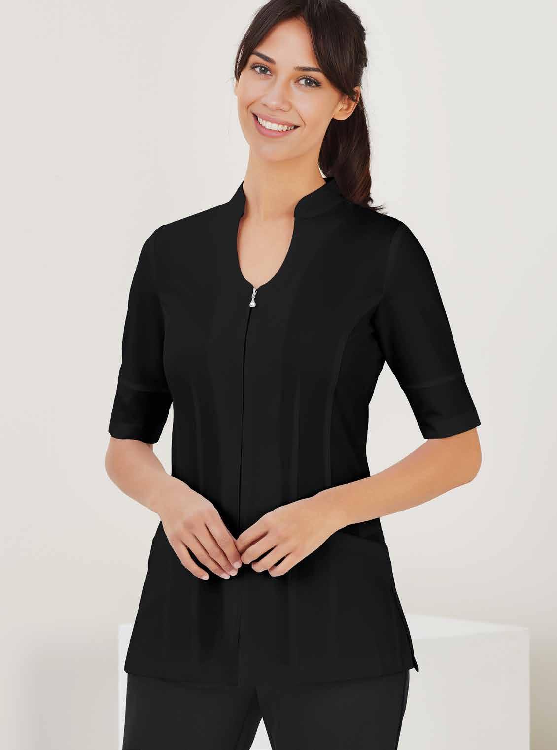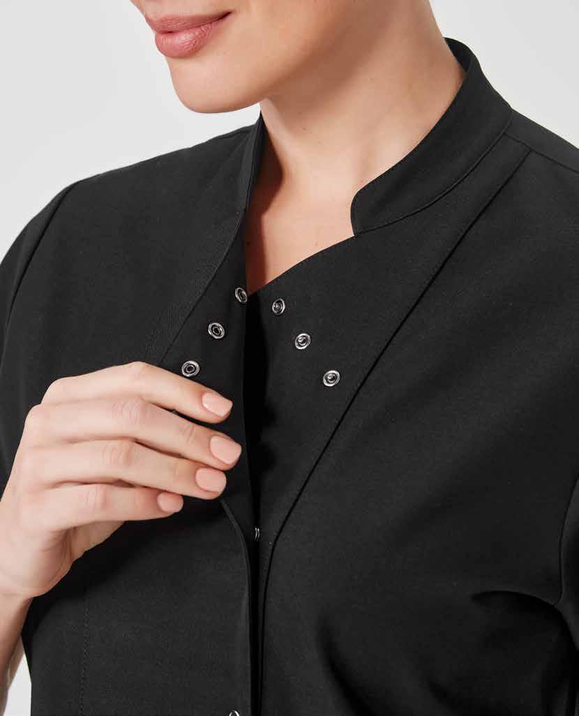 Bliss tunic, with Dupont™ Teflon ® stain release stretch fabric. Semi-fitted with side splits, longer length vented sleeves, 2-way zip with nickle free diamantè and front pockets.