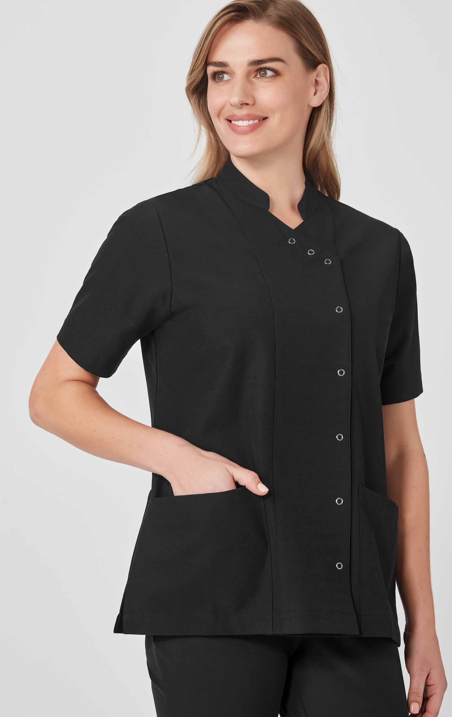 Eden tunic, with Dupont™ Teflon ® stain release stretch fabric. Front pockets, longer hem line, semi-fitted, side splits and center back action-back pleat.