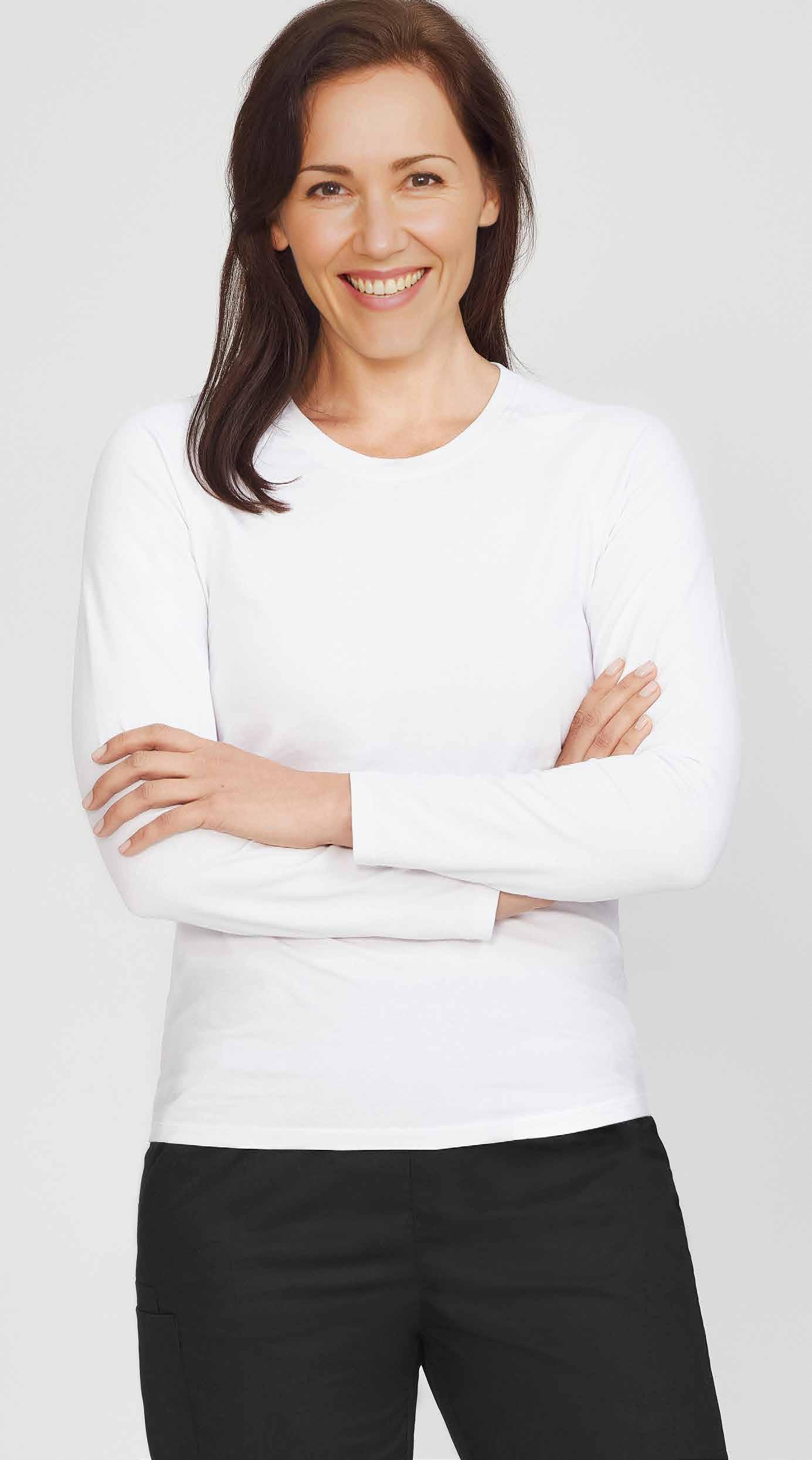 The perfect tee that can be worn as an underscrub or on its own. Made from soft cotton treated with SILVERPLUS ® antibacterial protection. Added stretch allows for extra movement and comfort. Designed to sit closer to the body.