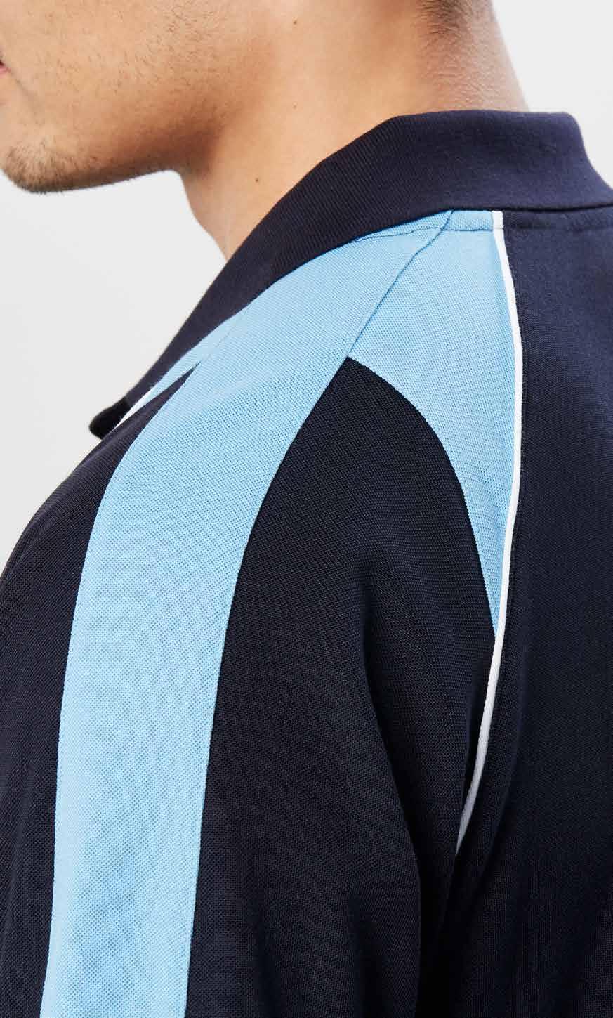 FEATURES Honeycomb weave with stretch elastane • Flat knitted collar with contrast button placket • Side panels with dynamic contrast piping • Unique print features on torso, sleeve and back neck to accent your logo • Longer length for added coverage when moving • Mens style includes loose pocket