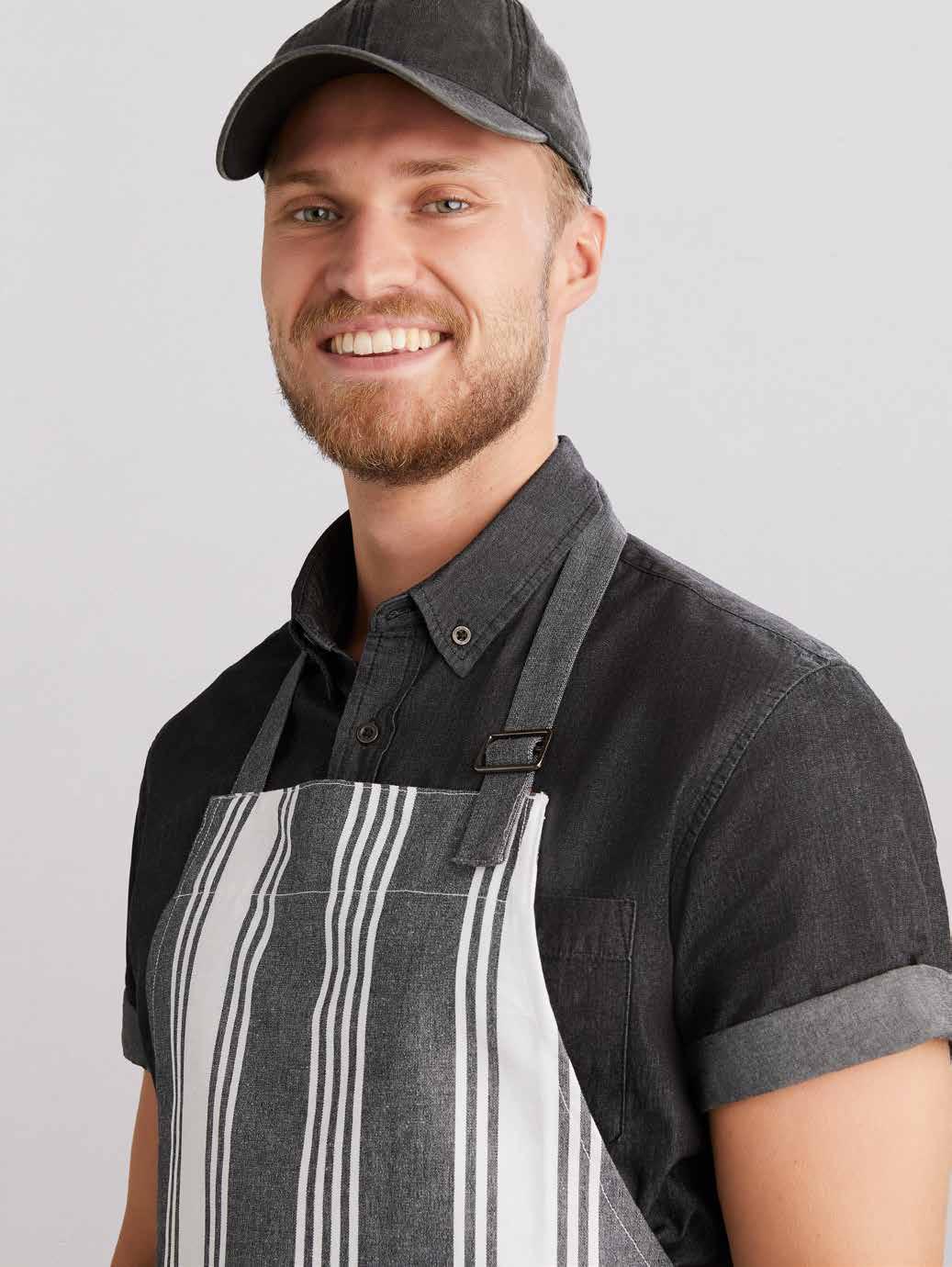 FEATURES Unique chambray statement stripe apron • Contrast divided front pocket with reinforced stitching • Attached straps with adjustable D-ring neck loop • Free size 93cm x 70cm