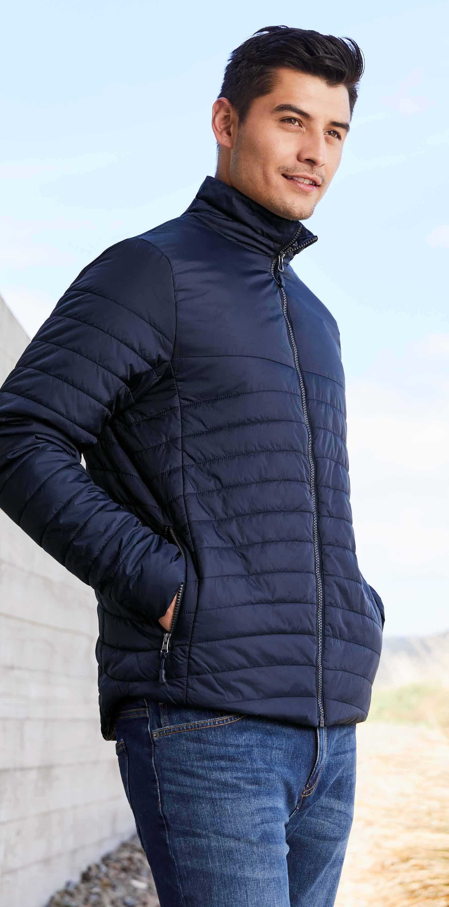 • Knitted stripe collar • Mens style includes loose pocket