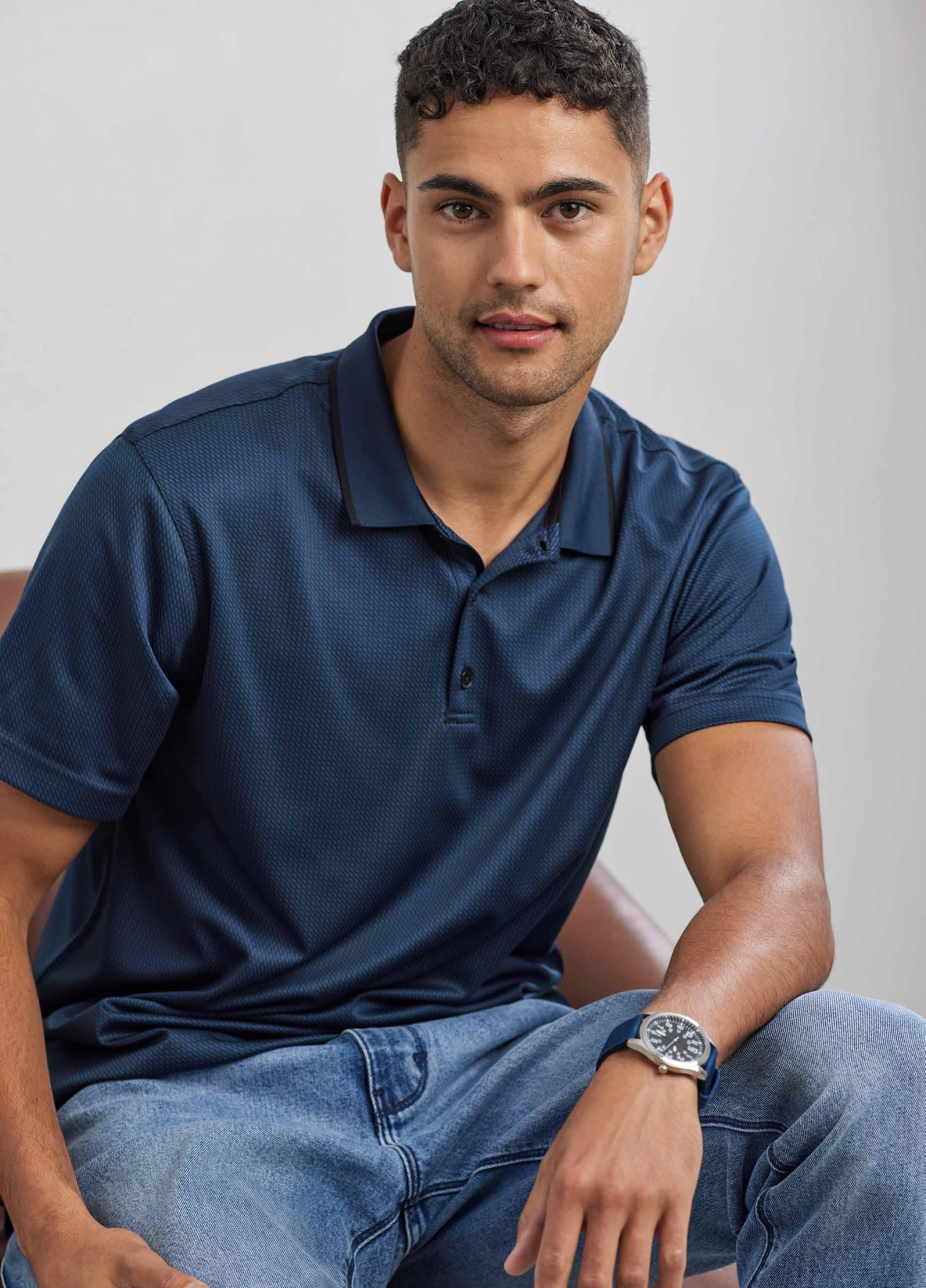 Stand out and stay cool in the perfect blend of performance and design. Crafted in a soft textured fabric with added stretch for all day ease and comfort.