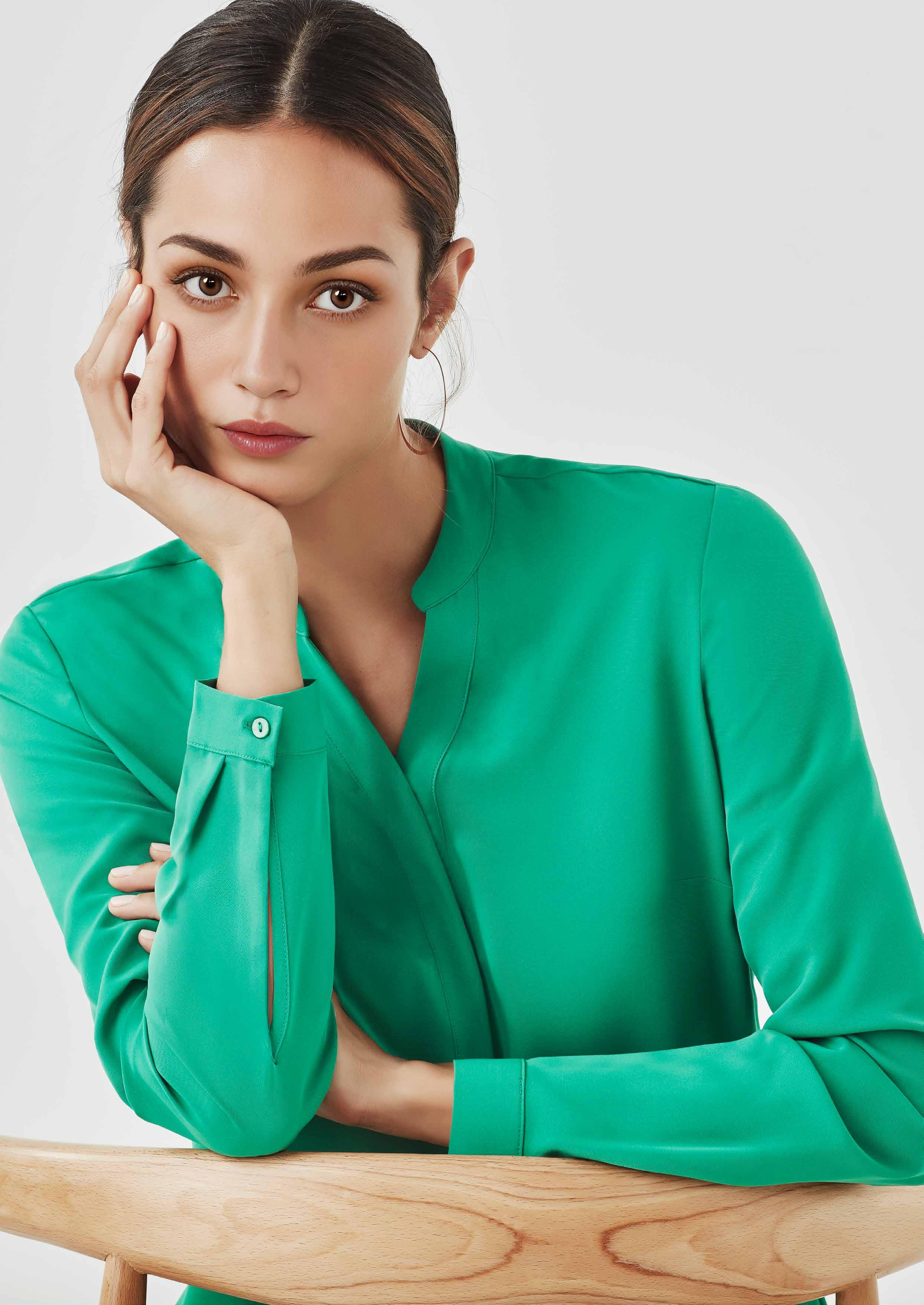 A versatile sleeve length and design. Soft elastic cuffs allow you to wear sleeves pushed up for a billowing sleeve effect or pulled down for a softer drape above the wrist.