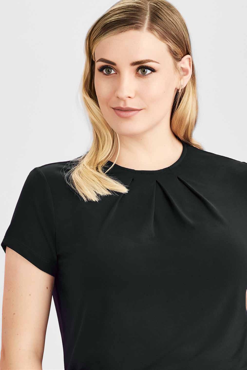 This short-sleeved style has a classic crew neckline with pleat details, it’s designed to be a semi-fitted top. Wear yours tucked in or out.