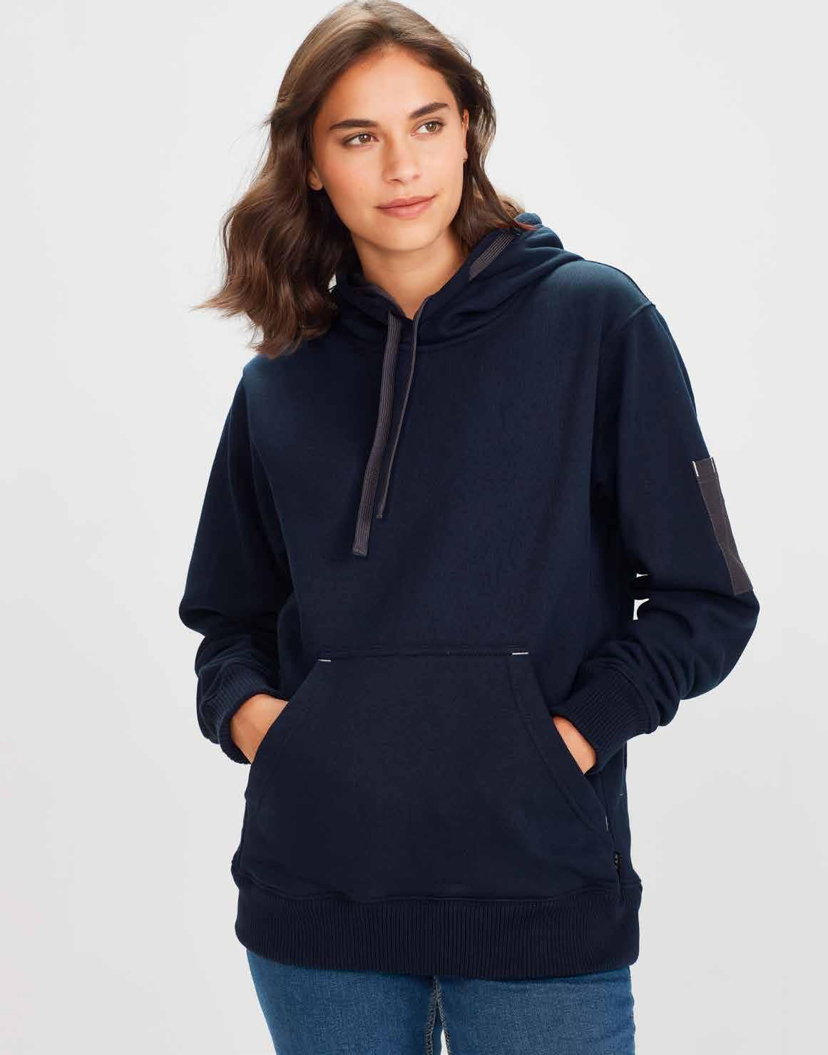 FEATURES Matching knitted collar • Durable flat lock raglan sleeve • Mens style includes loose pocket • Womens style features slimline placket