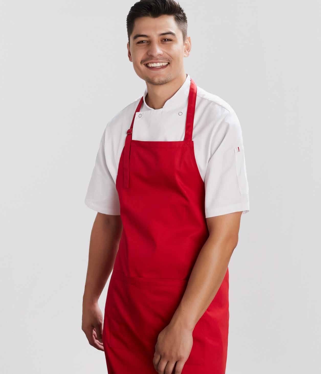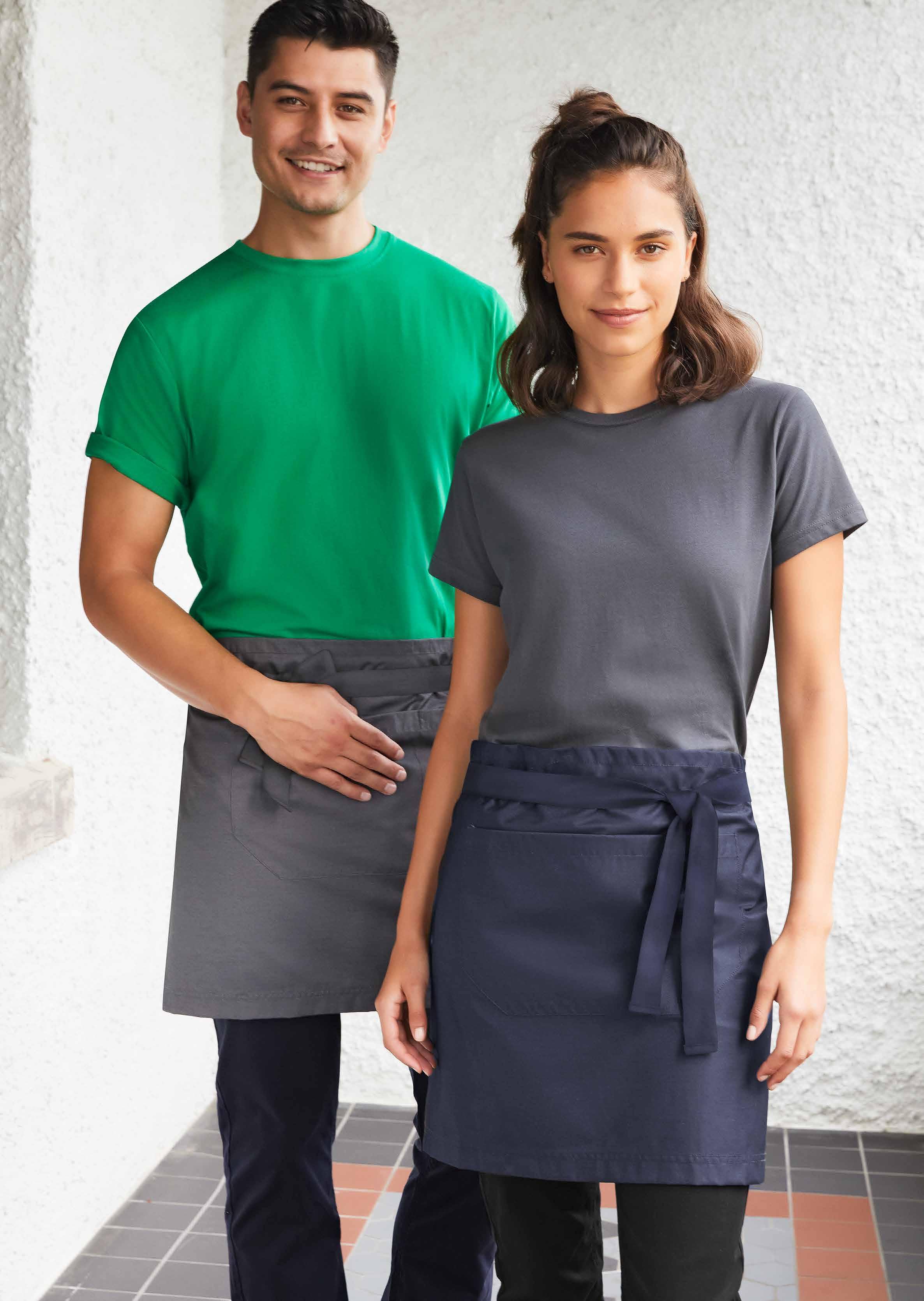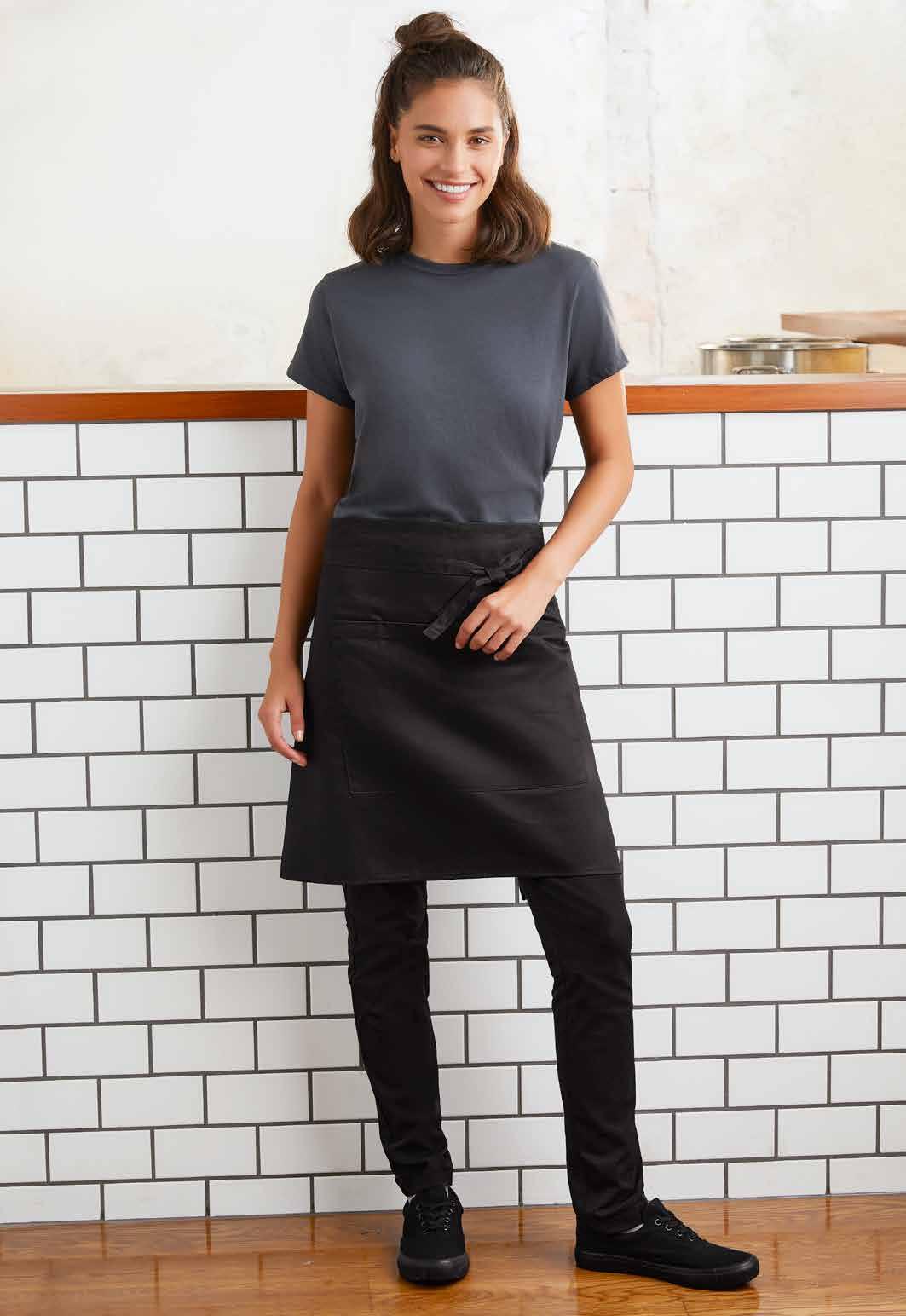 CARACTÉRISTIQUES Taille courte, au-dessus des genoux • Style unique • Anneau porte-serviette à l’arrière du tablier • 1 grande poche centrale à l’avant avec poche de côté spéciale pour crayon et ouvre-bouteille • Taille 34 po X 20 po