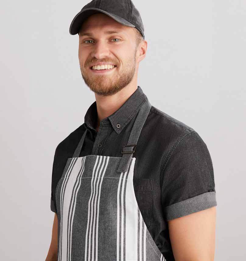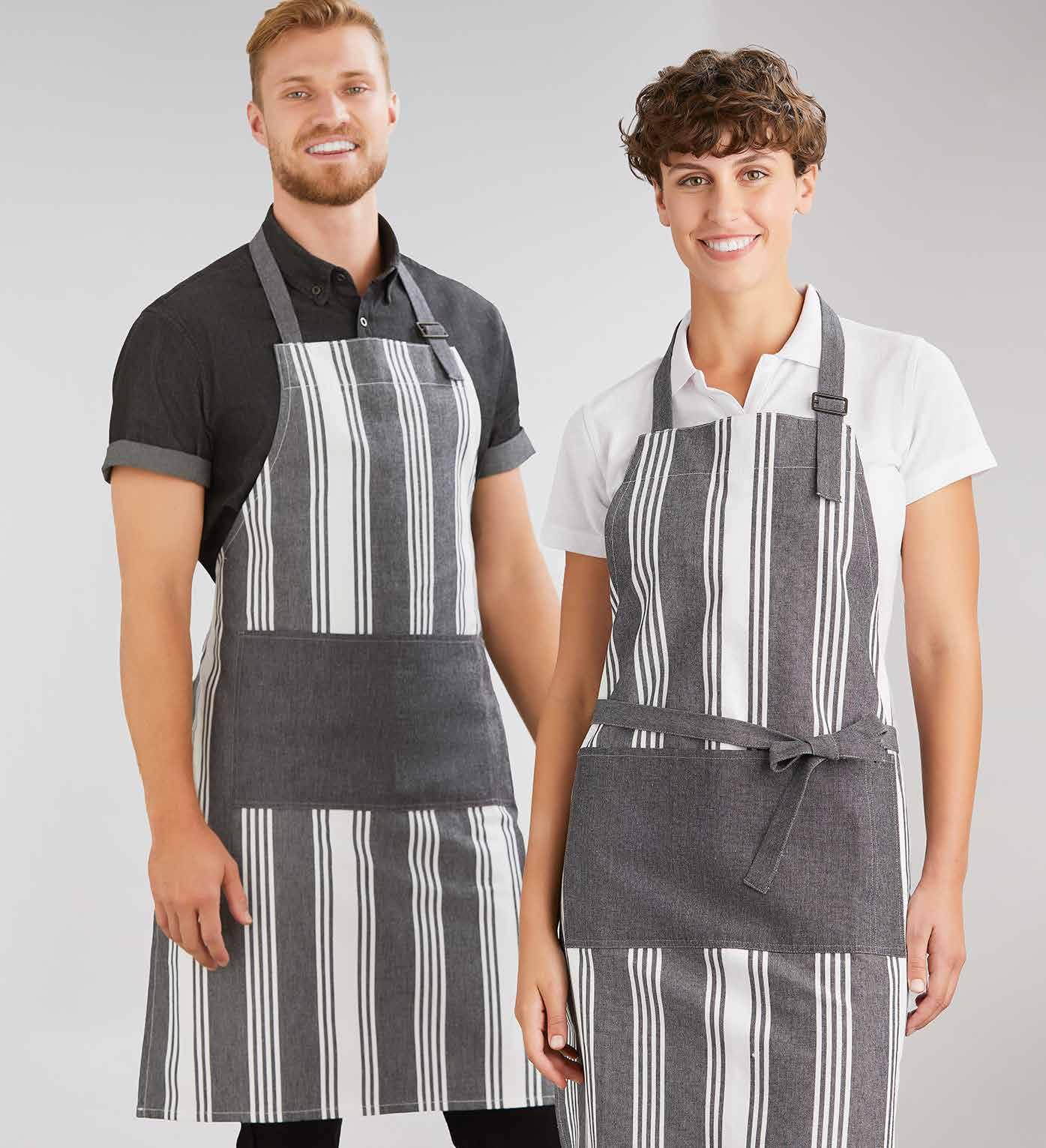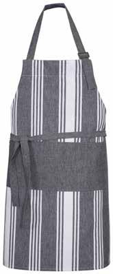 CARACTÉRISTIQUES Tablier chambray à rayures unique* • Poche divisée contrastante à l’avant avec coutures renforcées • Courroies fixes avec bretelle au cou ajustable à anneau en D • Taille 36.6 po X 27.6 po