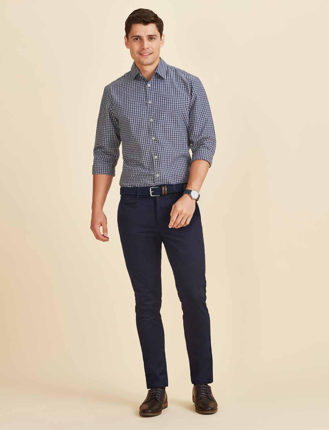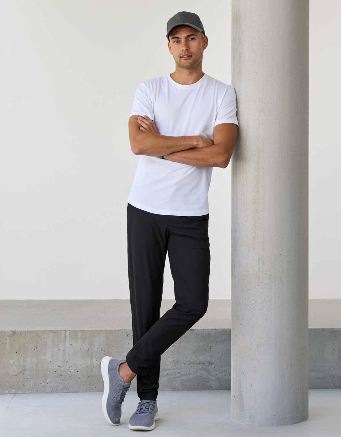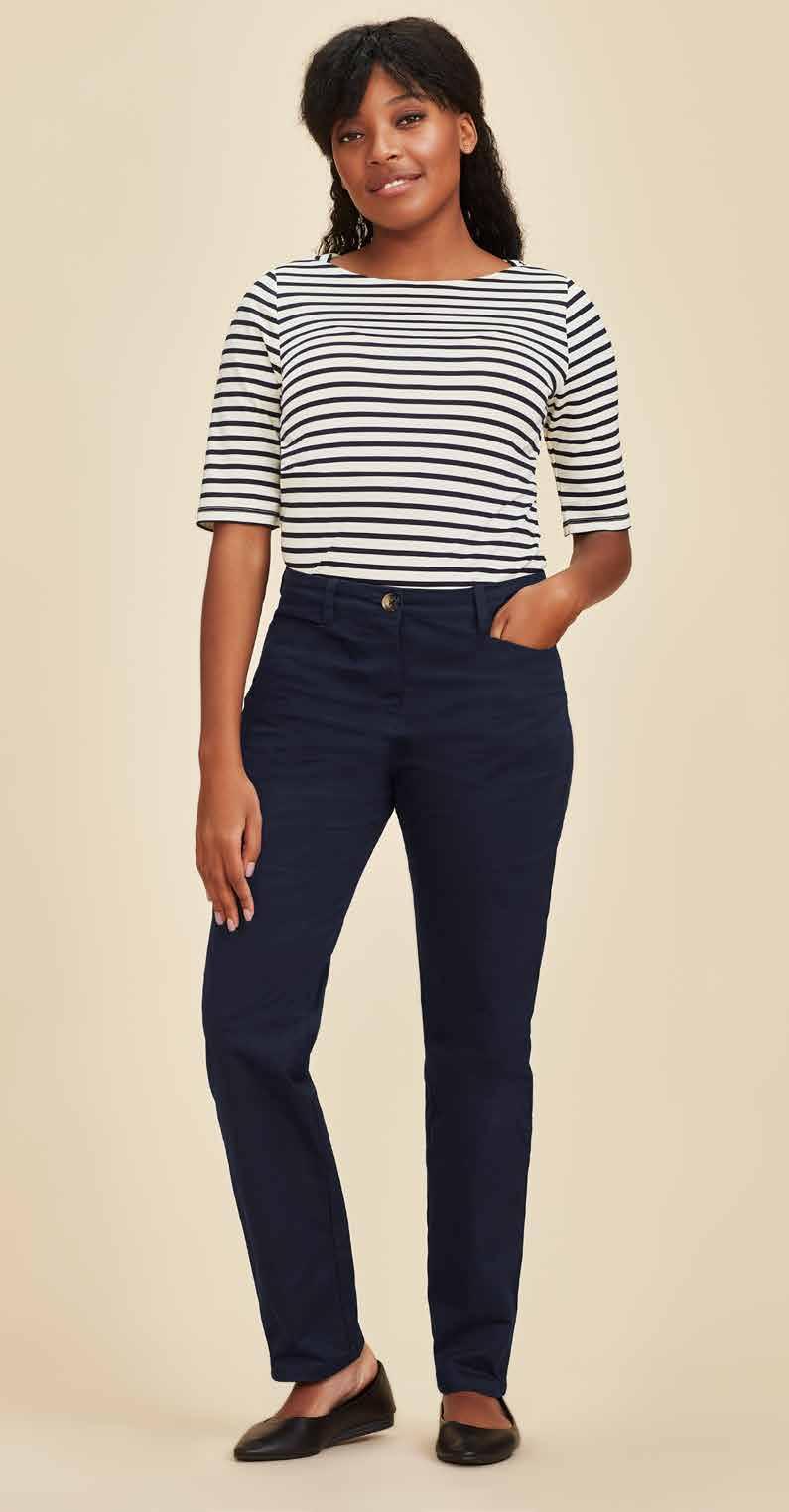 Taille mi-hauteur, semi-ajustée au niveau des hanches et des cuisses avec une jambe plus étroite.