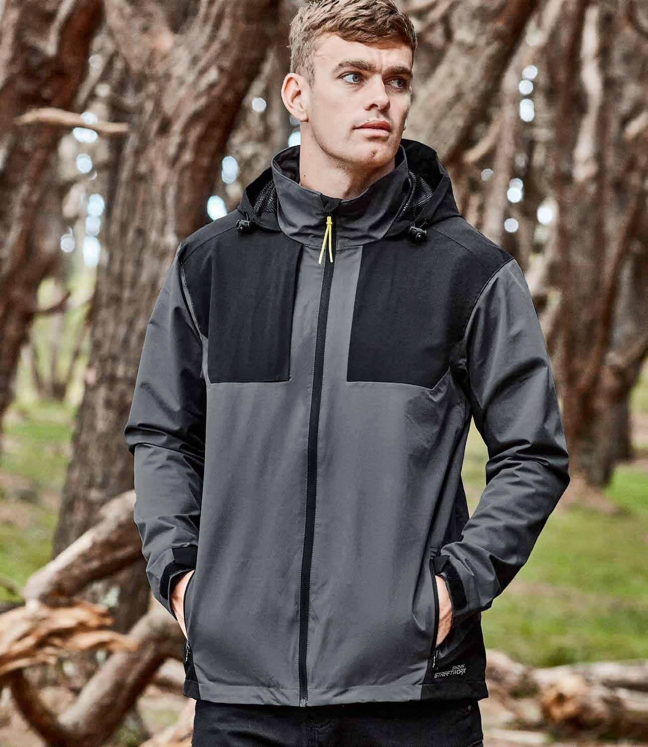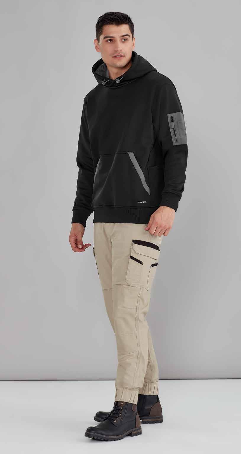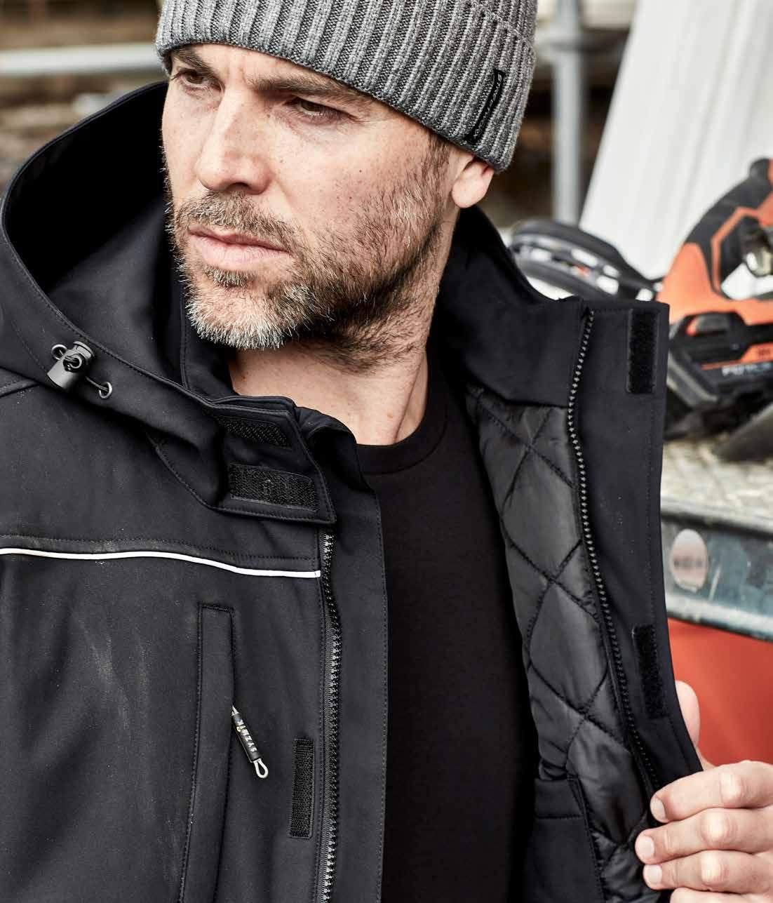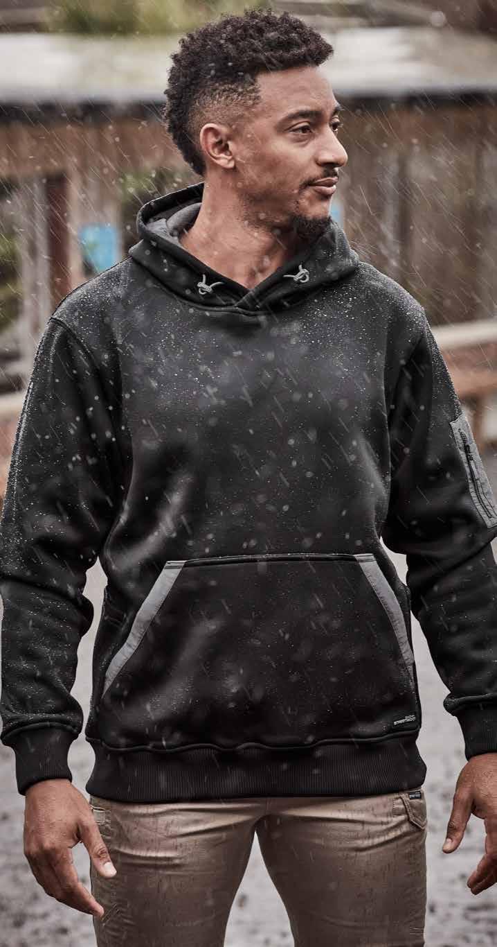 CARACTÉRISTIQUES Tissu imperméable léger évalué à 10 000 mm et coutures entièrement scellées • Tissu extensible dans 4 directions bougeant avec vous pendant que vous travaillez • Tissu respirant évalué à 4 500 g/m²/24 heures