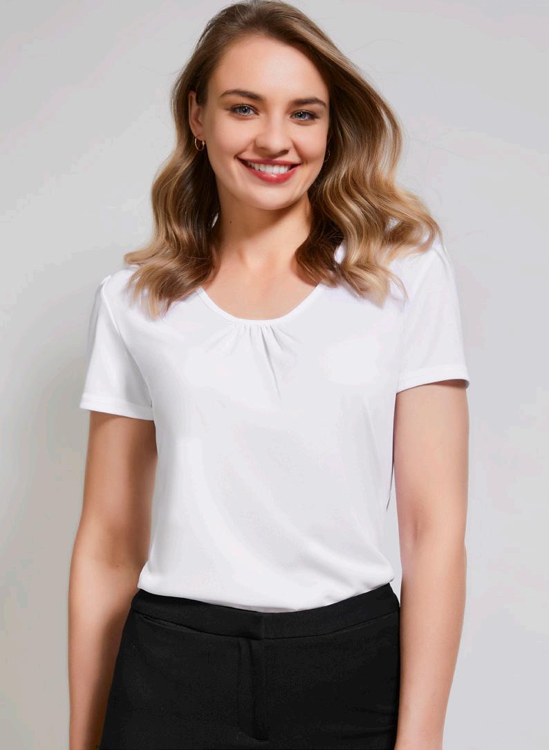 FEATURES Soft flowing, fashionable pleat fold V-neck detail • Dressed up classic T-shirt style that flatters your shape without clinging • Can be worn tucked in or out
