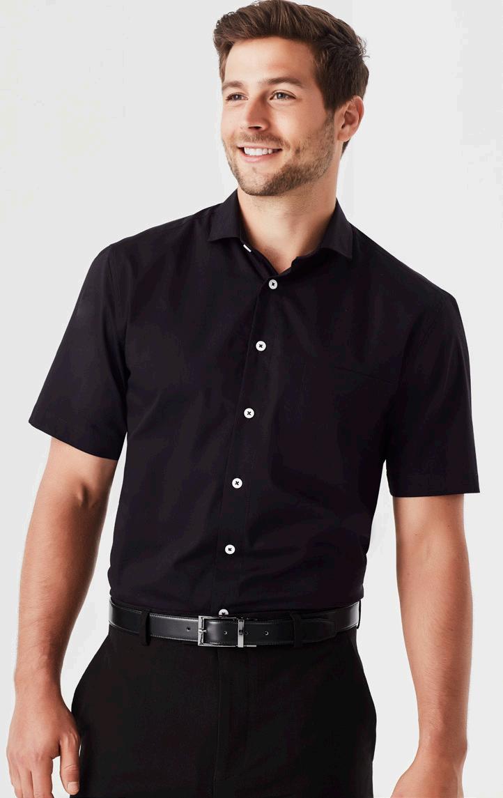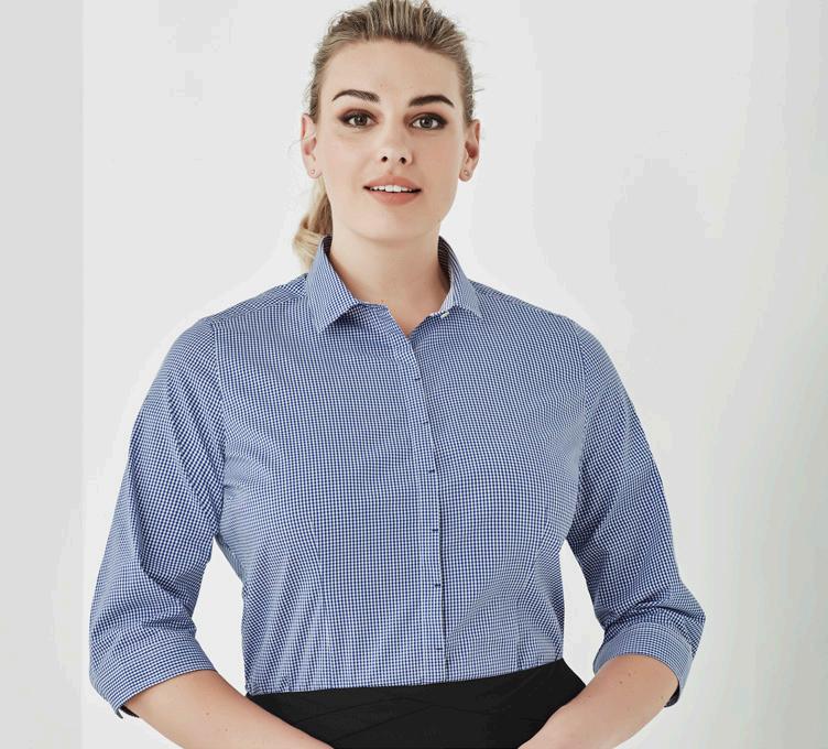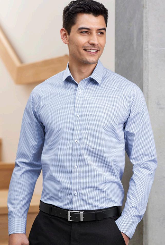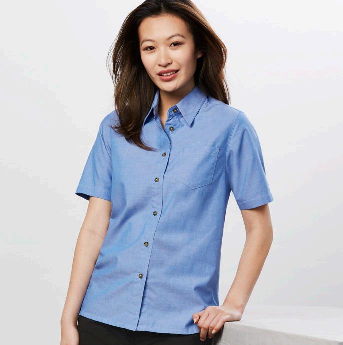 FEATURES Easy-iron • Mens style features a traditional fit with centre back box pleat, button down collar, twin stitched and chest pocket with tortoise shell buttons • Womens style features a relaxed fit with straight hem, side splits and chest pocket