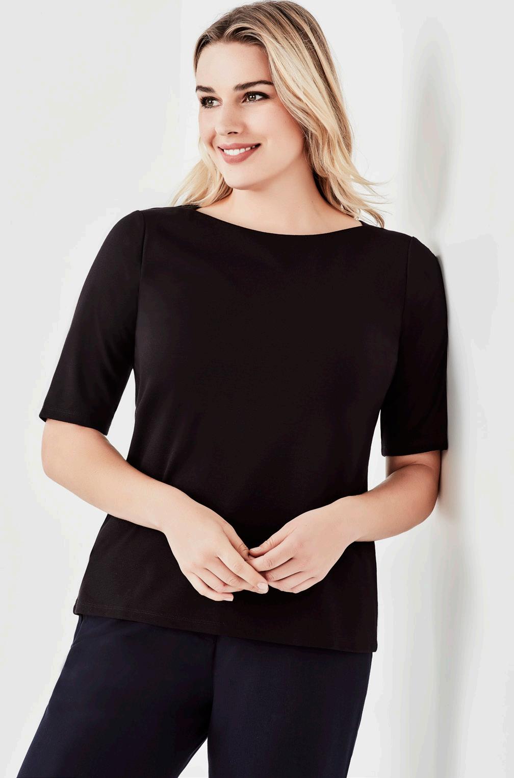 FEATURES Sleeve length ends just above elbow • Soft stretch knit provides stretch and comfort • Elegant boatneck detailing